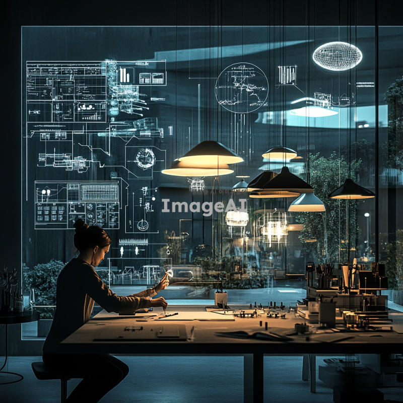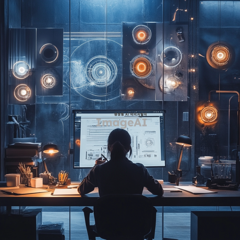 다양한 조명기구가 있는 미래적인 작업장에서 조명 디자인을 하고 있는 사람의 모습