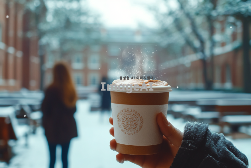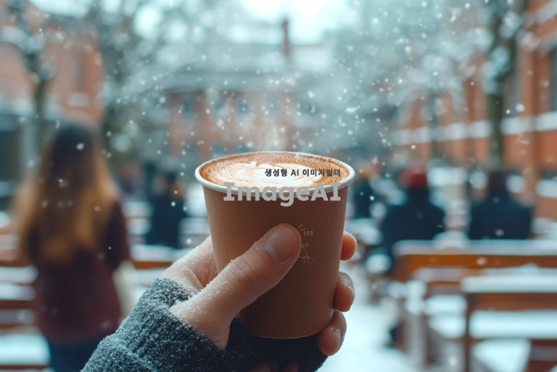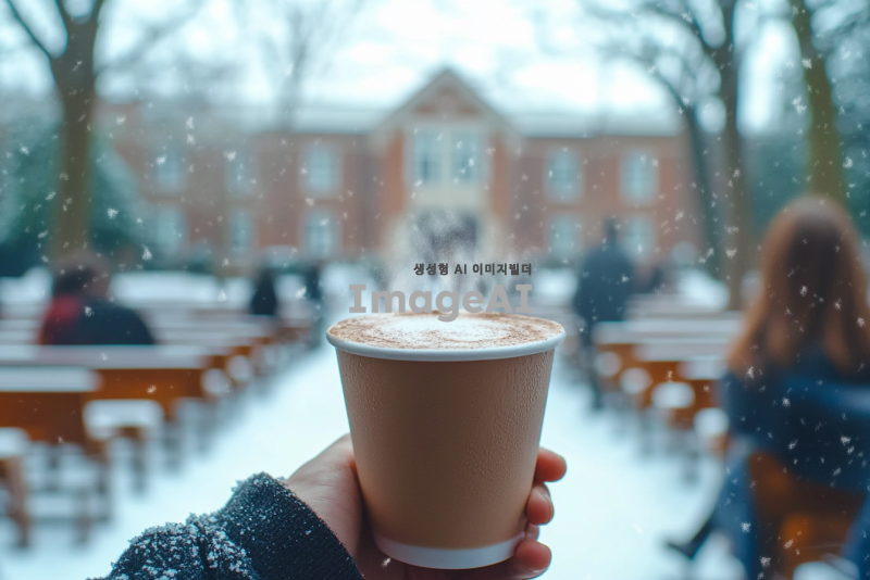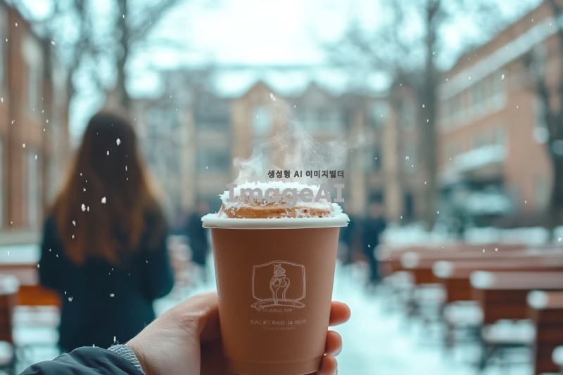 대학교 캠퍼스의 겨울 풍경, 따뜻한 핫초코를 손에 들고 있는 남자학생의 1인칭 시점. 주변은 눈이 내리고, 나무와 건물들이 겨울의 분위기를 자아내고 있다. 남자학생의 손에 들린 핫초코 컵이 따뜻한 증기를 내뿜고 있으며, 컵 주변에는 눈꽃이 살짝 쌓여 있다. 배경에는 친구들과 함께 있는 여학생의 모습이 흐릿하게 보인다. 긴장감과 설렘이 가득한 순간, 핫초코의 따뜻함이 느껴지는 장면.
