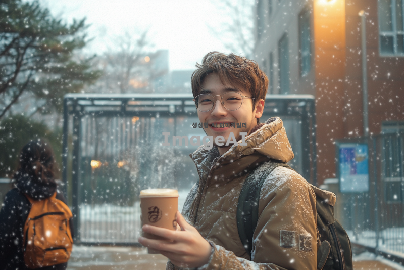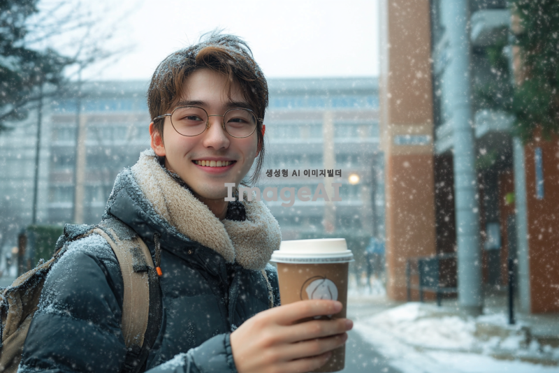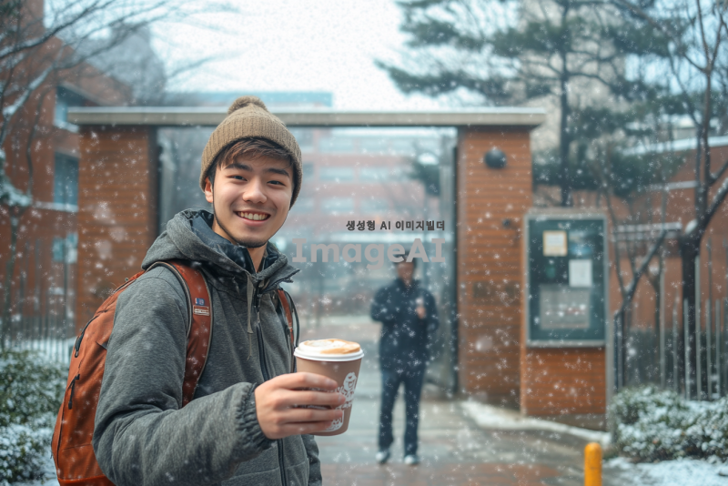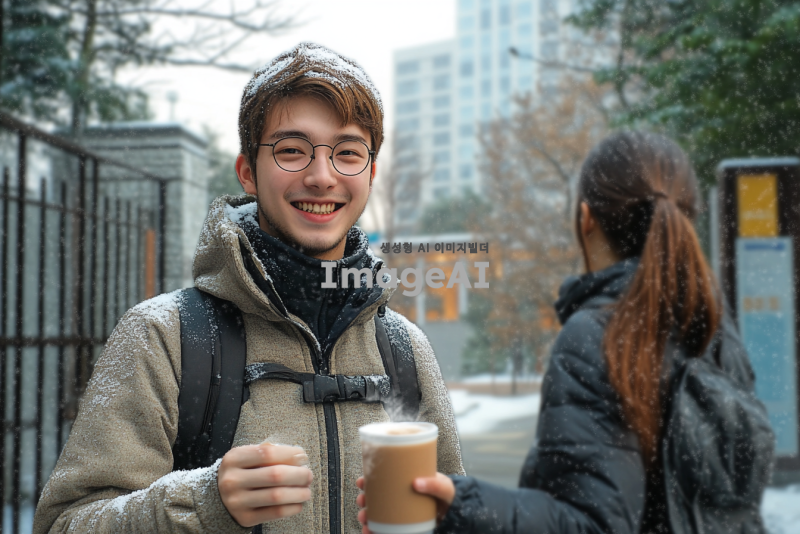 겨울의 고등학교 정문 앞, 후배가 따뜻한 핫초코를 손에 들고 나에게 건네는 순간을 1인칭 시점으로 표현. 주변은 눈이 쌓인 겨울 풍경으로, 후배는 따뜻한 옷을 입고 밝은 미소를 지으며 나를 바라보고 있다. 학교 건물과 나무들이 배경에 어우러져 겨울의 차가움과 따뜻함이 동시에 느껴지는 장면.