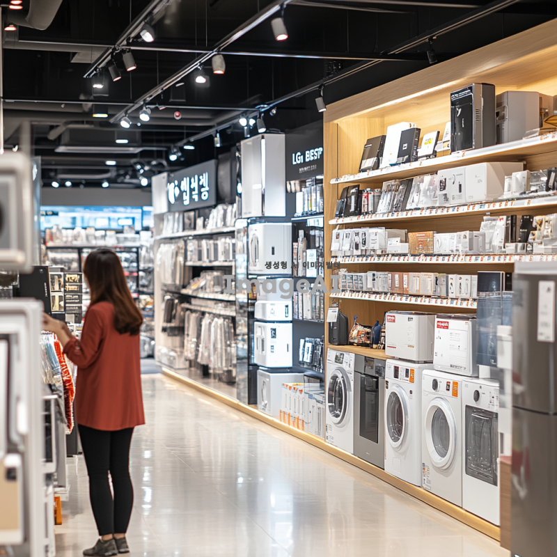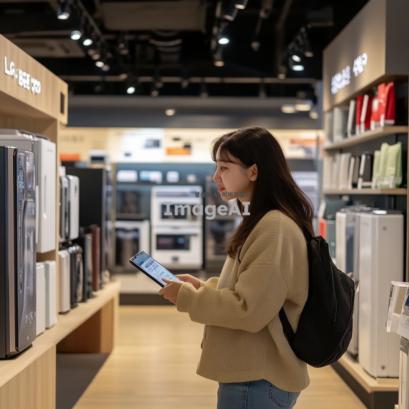 LG 베스트샵의 한정 할인 행사 홍보를 위한 이미지, 한국인 고객이 전자제품을 살펴보는 모습, 다양한 LG 가전 제품이 진열된 매장 내부, 화사한 조명 아래 즐거운 분위기, 할인 가격 태그가 붙어 있는 제품들, 인스타그램에 적합한 세련된 디자인, 현대적인 느낌, 매력적인 색상 조합, 고객이 제품에 관심을 가지는 모습.