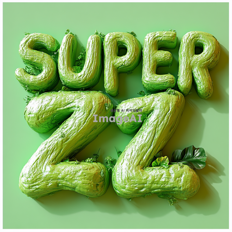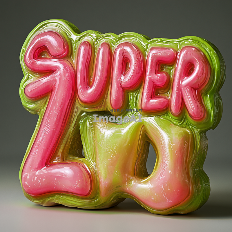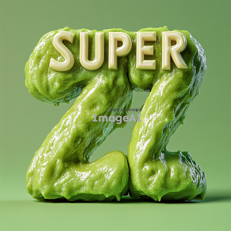 동글동글 입체적인 3d 레터링으로 SUPER Z 라는 글씨를 보여주는 이미지. 재질은 폭신폭신하고 매끄럽고, 컬러는 형광 라임컬러. 말랑말랑해보이는 글씨가 조금씩 뭉쳐져 찰흙으로 만든 오브제처럼 보임. 배경은 부드러운 그라데이션으로 처리되어 있어 텍스트가 돋보이도록 구성.