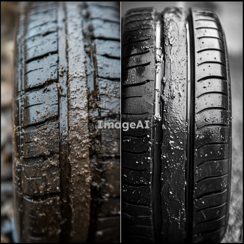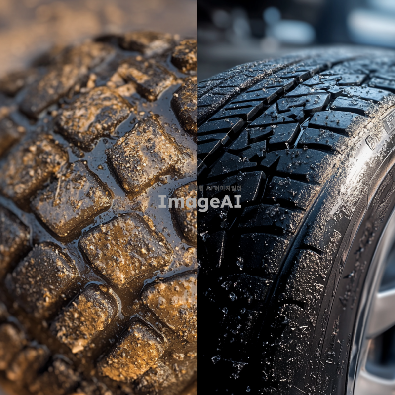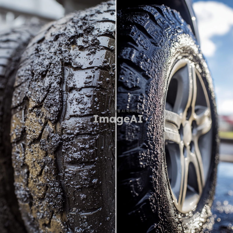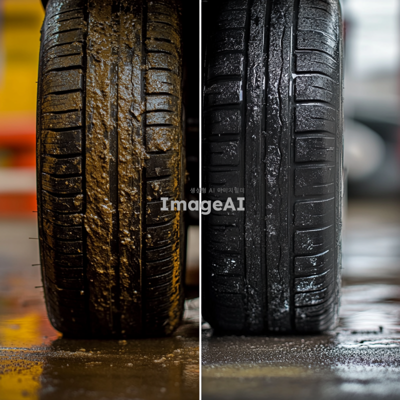 타이어 세척 전과 후의 사진을 반으로 나누어 보여주는 이미지. 왼쪽에는 더럽고 오염된 타이어의 클로즈업, 오른쪽에는 세척 후 깔끔하게 광택된 타이어의 클로즈업. 두 이미지의 대비가 뚜렷하게 드러나도록 구성.