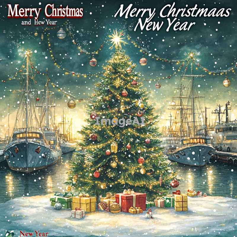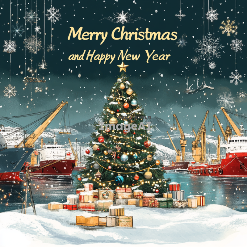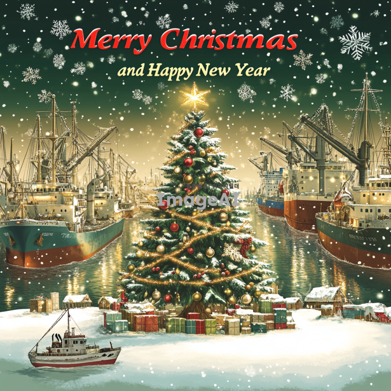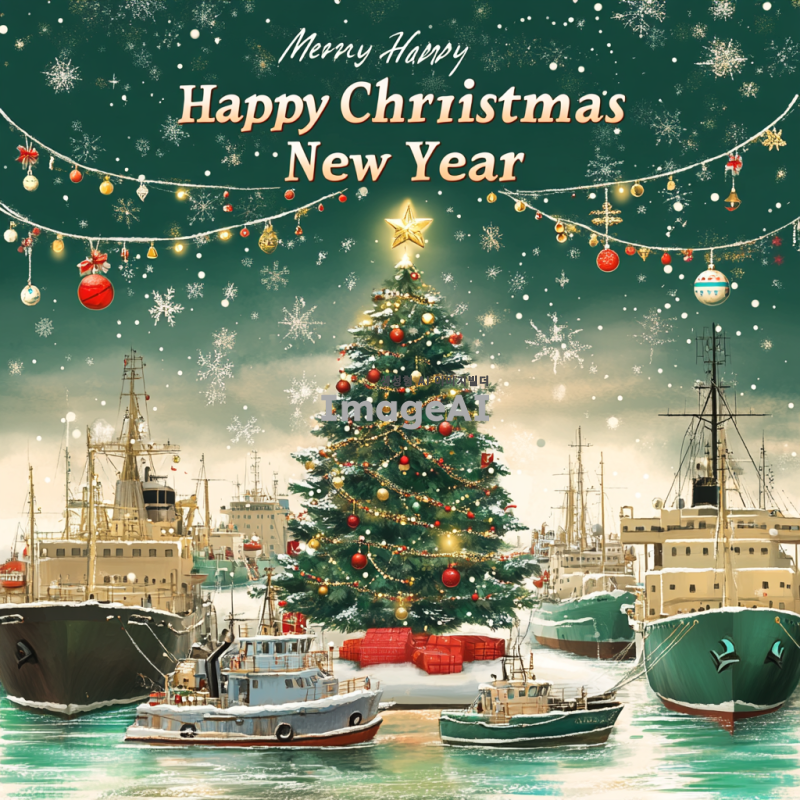 크리스마스와 신년을 맞이하여 ASIANLINK 선박회사의 축하 카드를 디자인합니다. 배경은 겨울 풍경으로, 눈이 내리는 항구를 묘사하며, 항구에는 다양한 선박들이 정박해 있습니다. 카드의 중앙에는 크리스마스 트리가 장식되어 있고, 주변에는 반짝이는 조명과 장식들이 걸려 있습니다. 상단에는 "메리 크리스마스와 행복한 새해"라는 메시지가 아름다운 서체로 적혀 있습니다. 카드의 색감은 따뜻한 크리스마스 색조인 빨강, 초록, 금색을 사용하여 아늑하고 기쁜 분위기를 연출합니다.