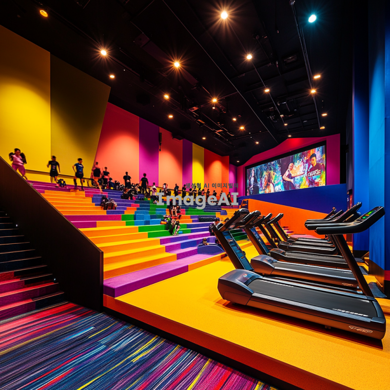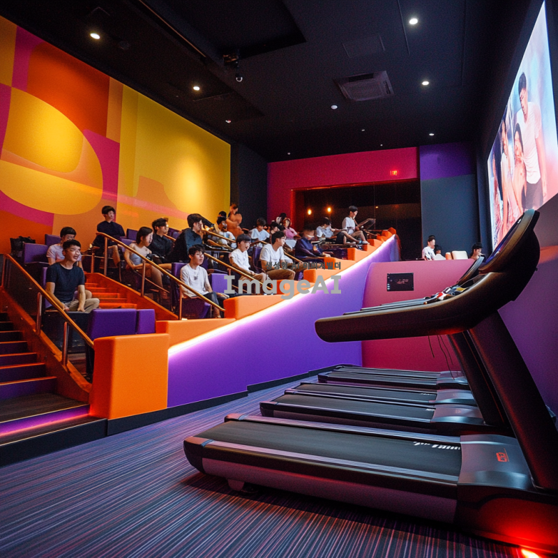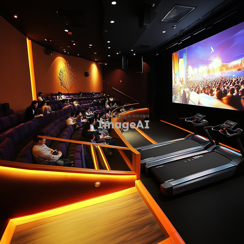 극장 내부, 오른쪽에 위치한 런닝머신, 현대적인 디자인, 조명이 밝고 화려한 극장 분위기, 관객들이 영화를 감상하는 모습, 런닝머신 위에서 운동하는 한국인 남성, 실내 운동과 영화 관람이 조화를 이루는 장면, 생동감 넘치는 색감.