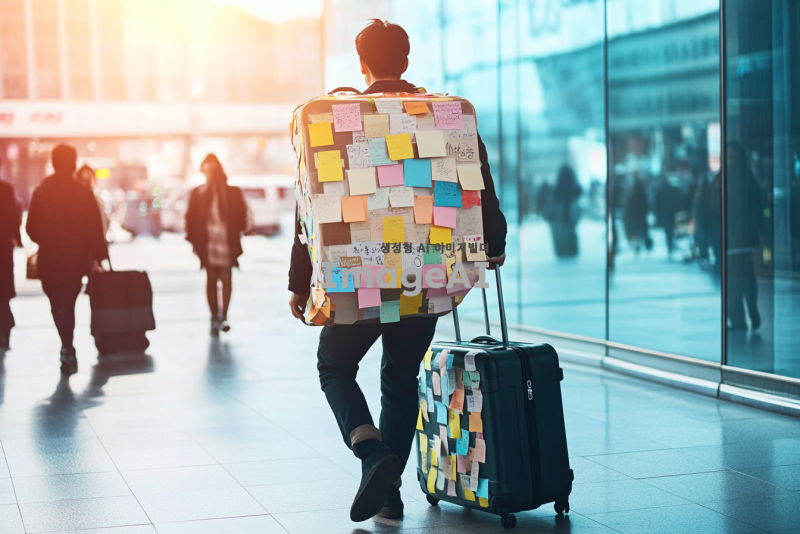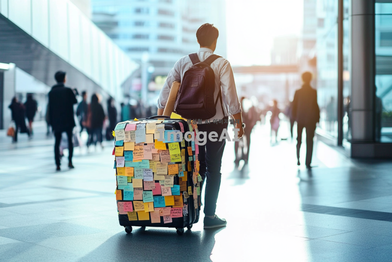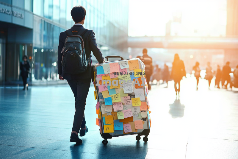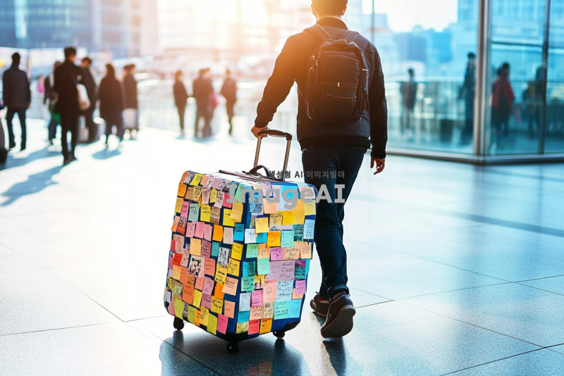 다양한 색깔의 포스트잇이 붙어 있는 케리어를 끌고 가는 한국인 남성의 모습. 케리어는 화려하고 독특한 디자인으로, 포스트잇은 여러 가지 메시지와 그림이 그려져 있어 생동감 넘치는 분위기를 자아낸다. 배경은 도심의 거리로, 사람들이 오가는 모습이 보이고, 햇살이 밝게 비추는 따뜻한 날씨를 표현한다.