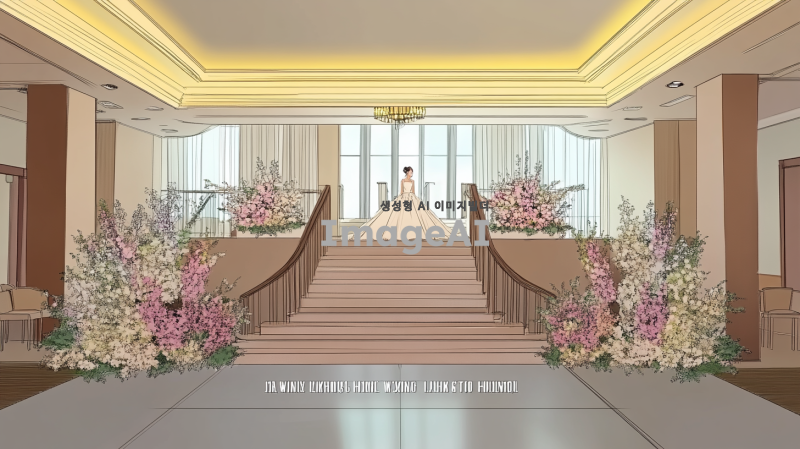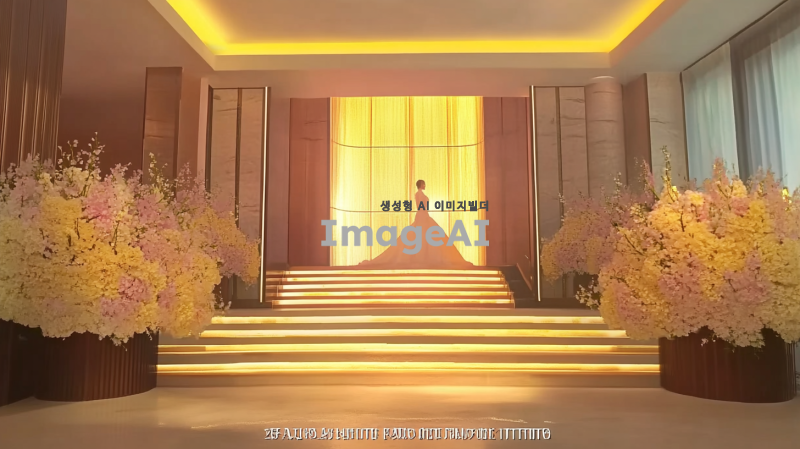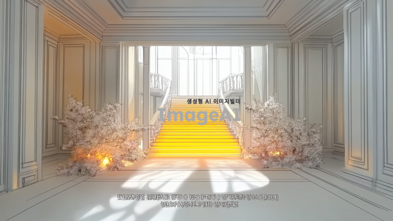 링크호텔의 신부대기실을 그려줘 양쪽벽을 막고 아래 계단을 2개 만들어줘 계단 간접조명은 노란빛이야
