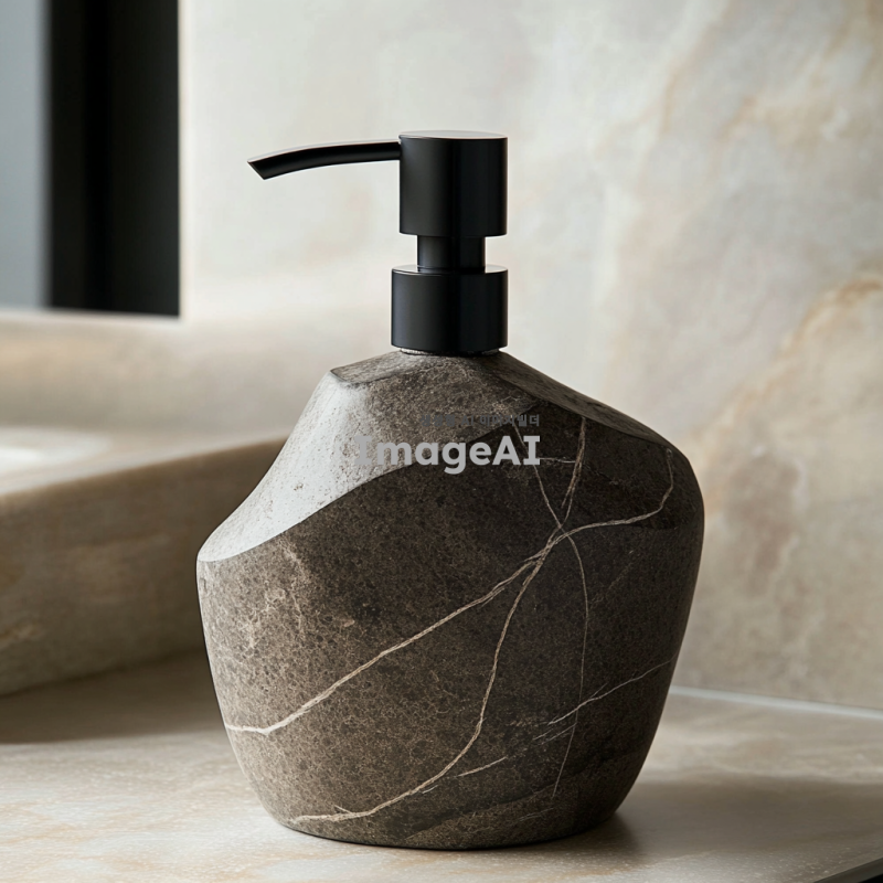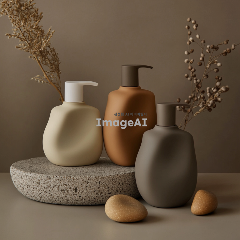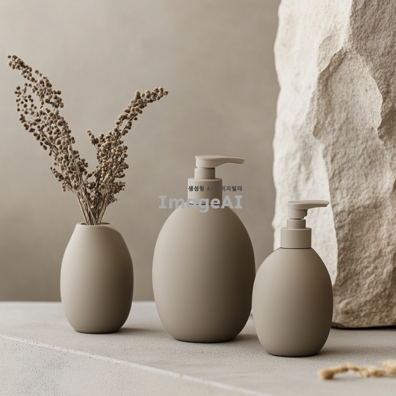 바위를 모티브로 한 샴푸 용기 디자인, 매스감이 느껴지는 형태, 표면은 모카크림 색상, 세미매트 광택 처리, 자연적인 요소와 조화를 이루는 디자인, 현대적이고 세련된 느낌 강조.