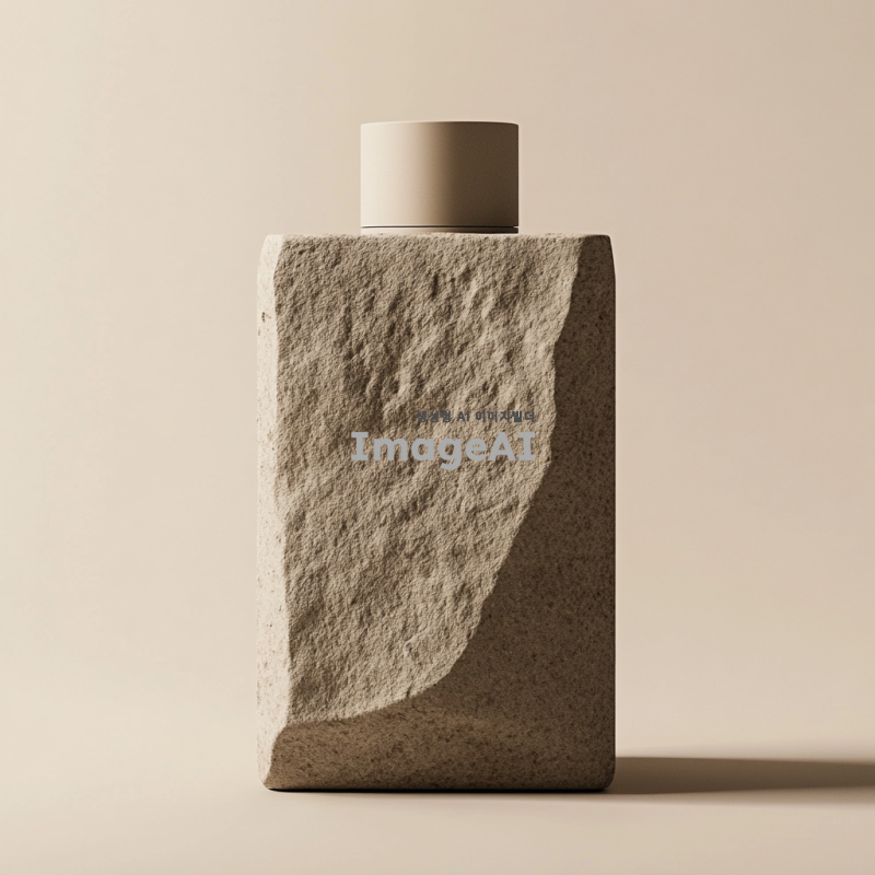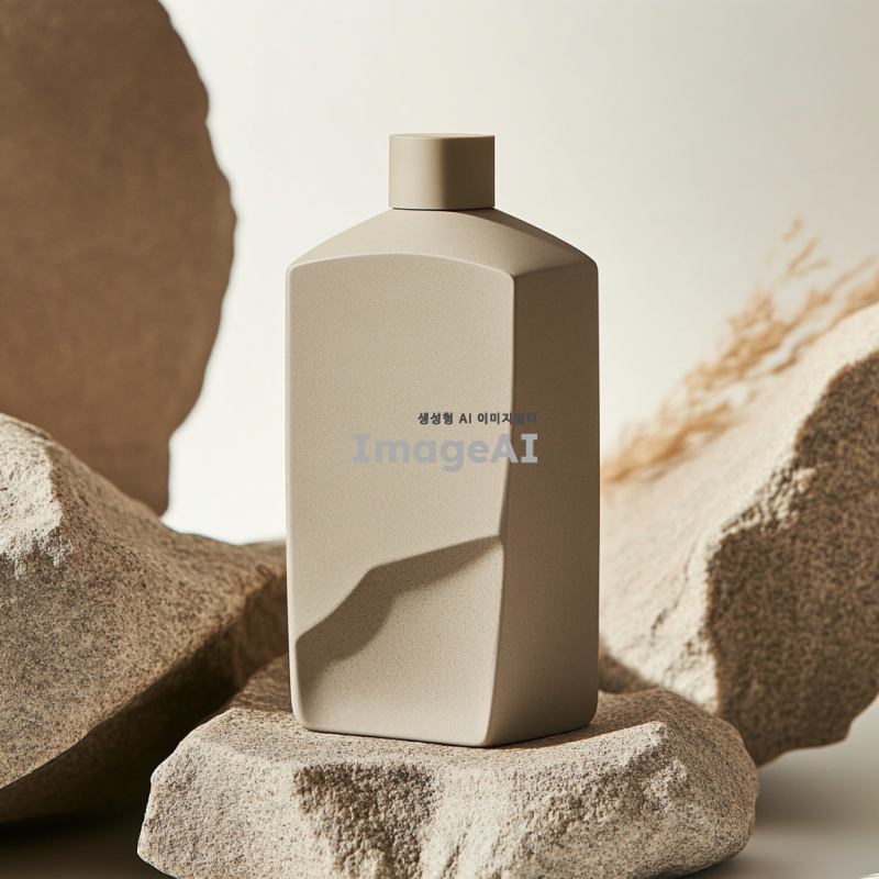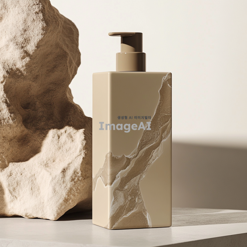모카크림색의 세미매트 광택을 가진 직육면체와 비슷한 형태의 바위를 모티프로 한 샴푸 용기 디자인, 자연적인 느낌을 주며 심플하고 세련된 스타일, 바위의 질감을 살려서 유기적인 곡선과 직선이 조화를 이루는 형태, 전체적으로 고급스러운 이미지 강조.