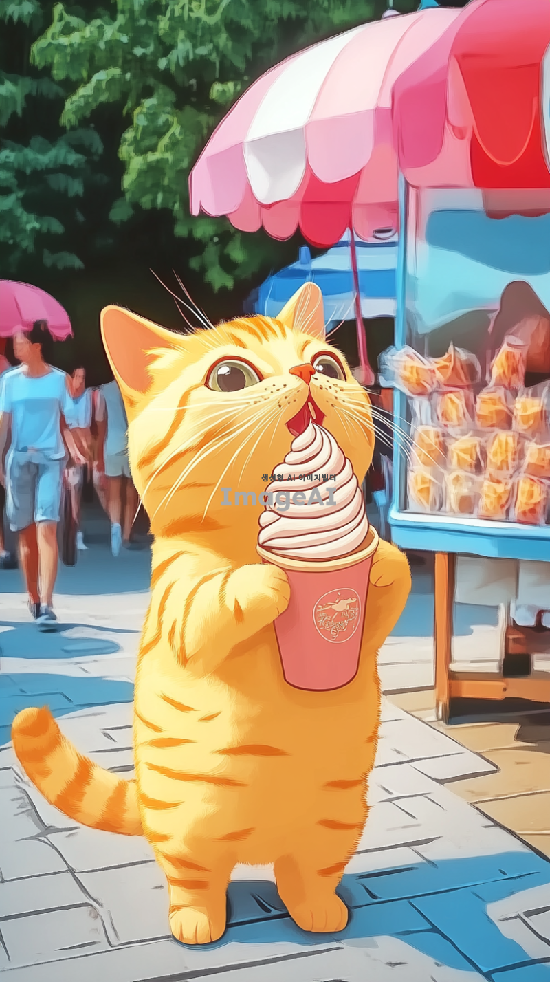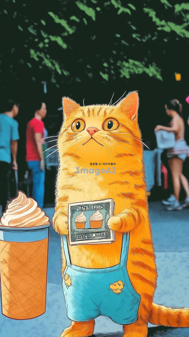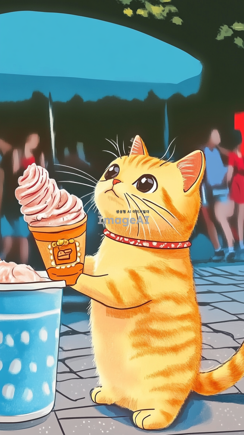 노란색 고양이가 아이스크림을 먹고싶은데 지갑을 열어보니 돈이 없는 모습을 그려줘