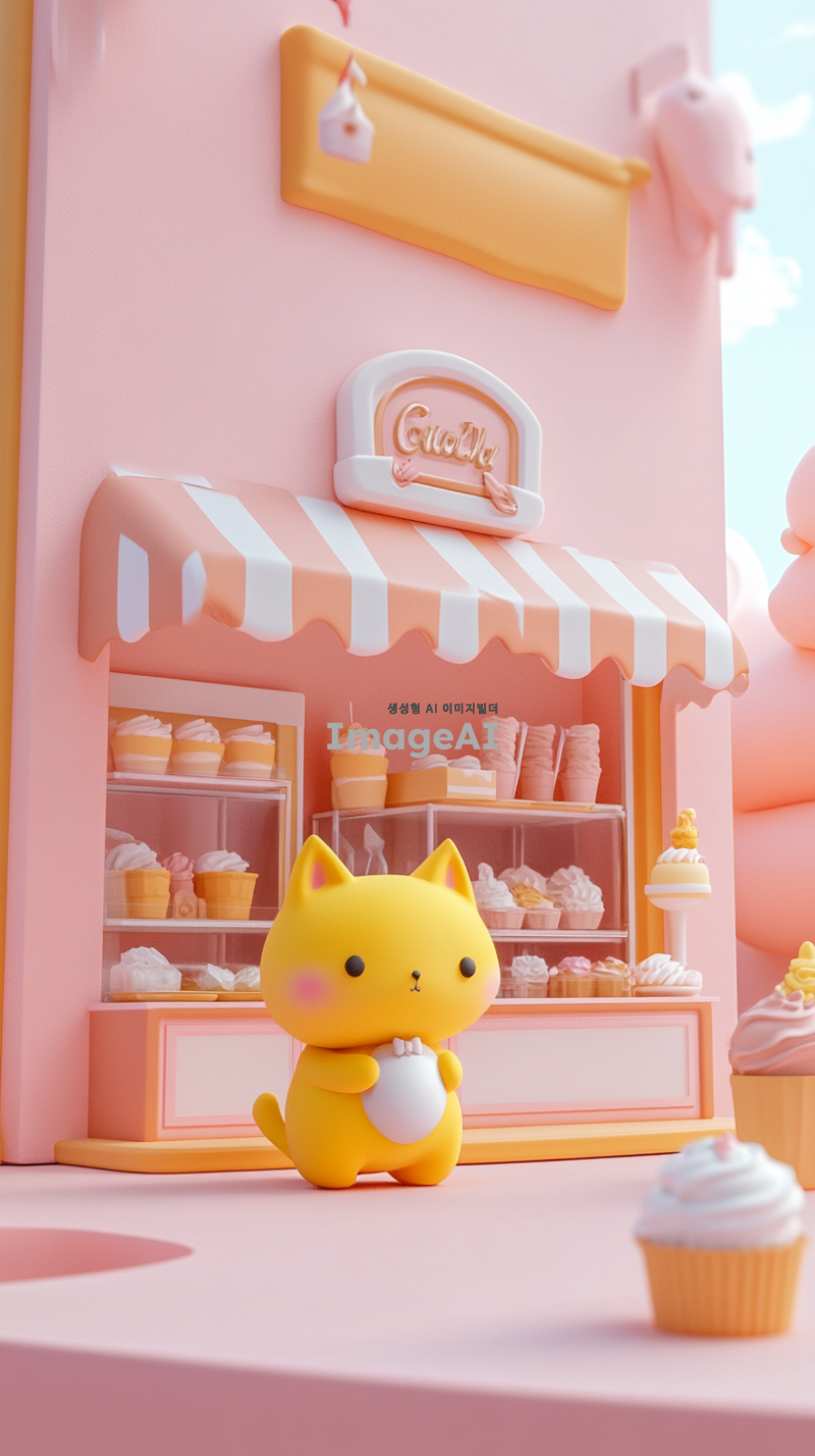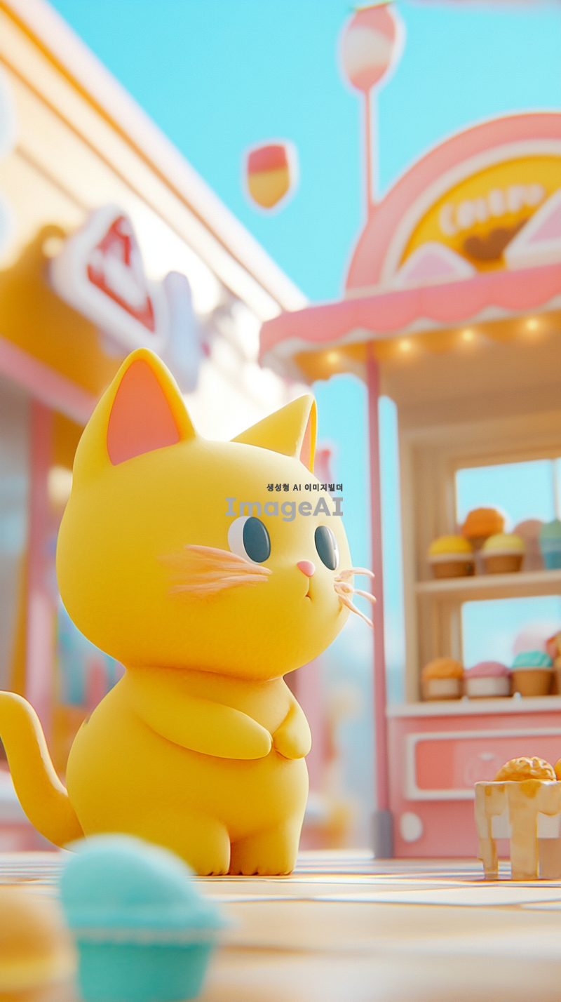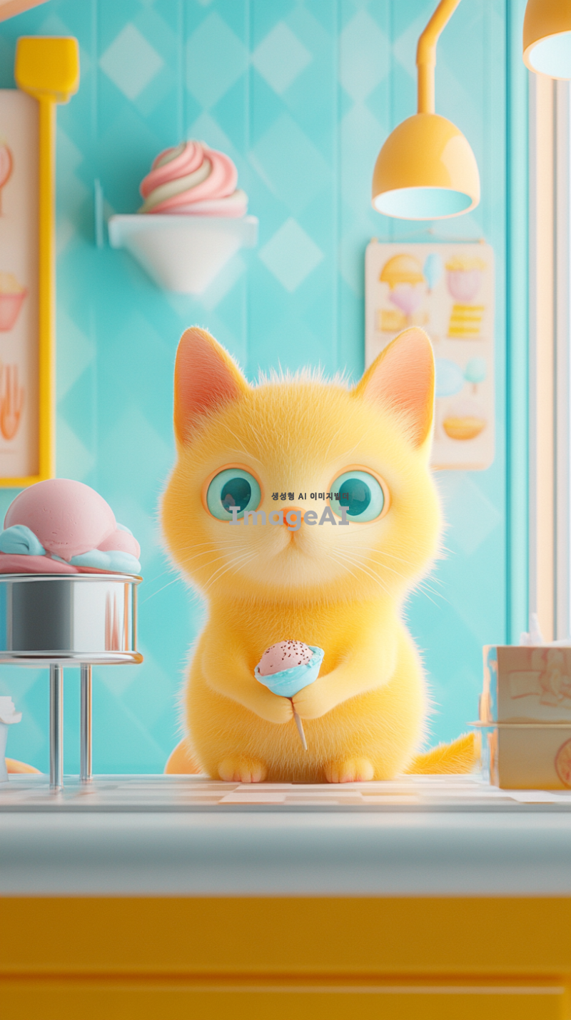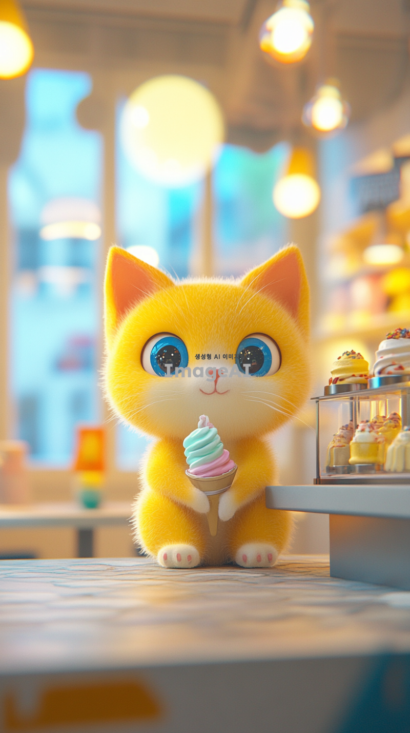 3D로 표현된 귀엽고 장난스러운 노란색 고양이, 아이스크림 가계, 노란색 고양이가 돈이없는 모습