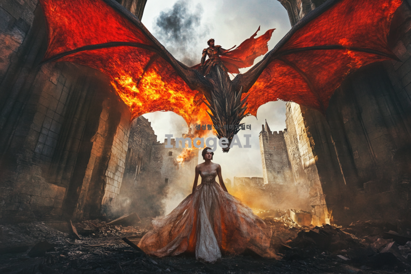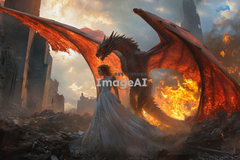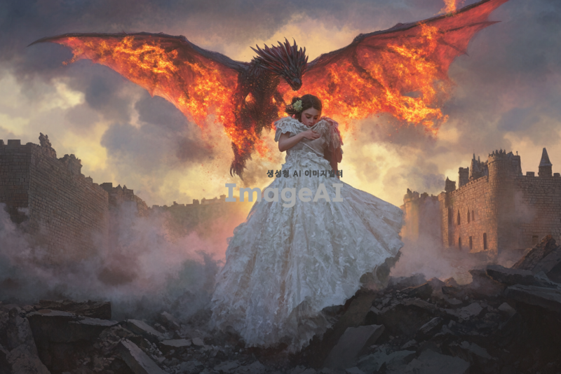 폐허가 된 왕국의 배경 속, 공주가 엉망이 된 드레스를 입고 슬퍼하는 모습. 공주 위에는 용이 왕자를 납치해 가는 장면이 보인다. 용은 거대한 날개를 펼치고 있으며, 불꽃이 입에서 뿜어져 나오는 모습. 공주의 얼굴에는 두려움과 슬픔이 가득하고, 주변에는 파괴된 성과 잔해들이 흩어져 있다. 어두운 하늘 아래, 긴장감 넘치는 순간을 포착한 이미지. 공주의 드레스는 잿더미의 일부가 된지 오래고, 흩날리는 먼지만이 그녀의 몸을 가려주고 있다.
