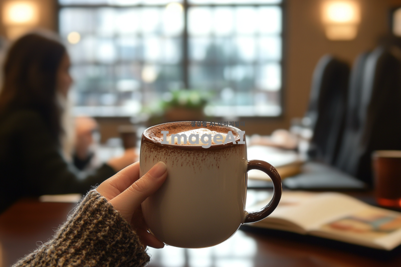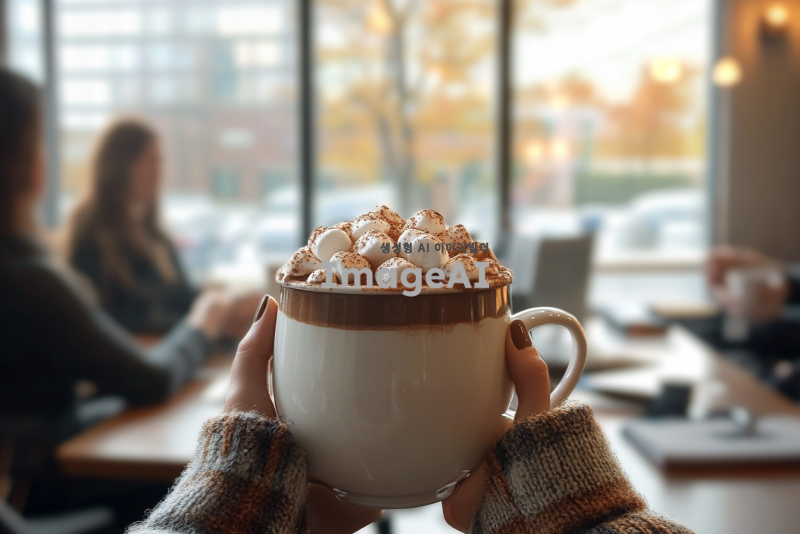 회의 전에 핫초코를 손에 들고 있는 모습이야 일인칭 시점으로 보여주고 장소는 회의실. 핫초코 안에 마시멜로우 토핑이 있었으면 해