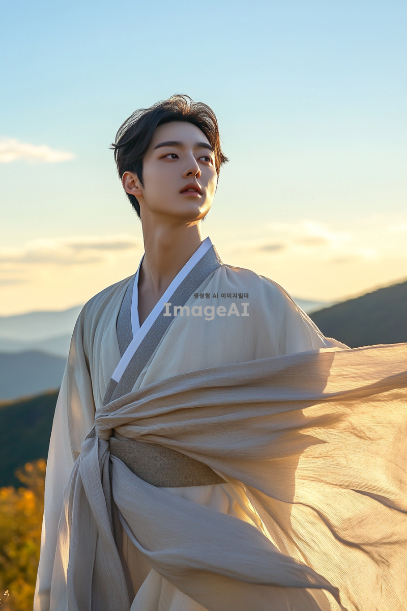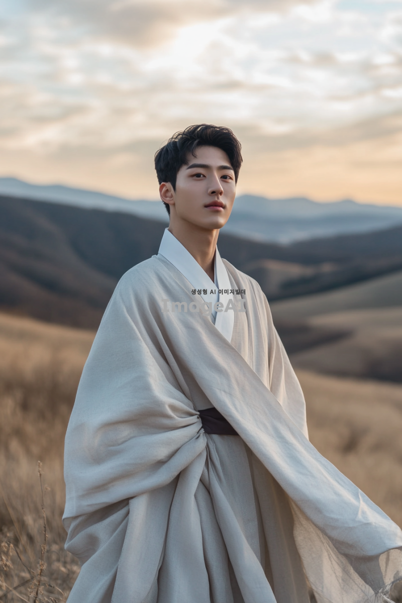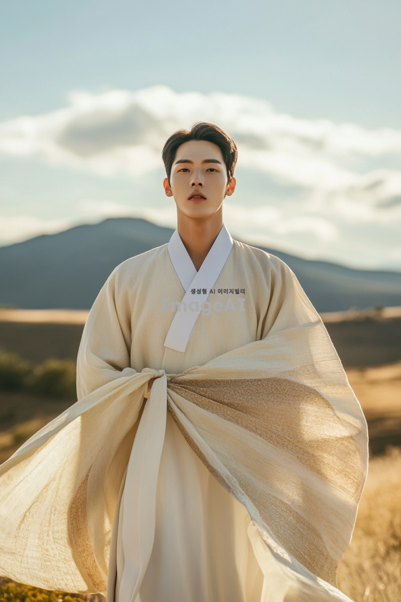젊고 매력적인 20대 한국 남성이 한국의 전통 복식을 재해석한 옷을 입고, 산맥과 초원, 언덕, 광활한 평야의 아름다운 풍경을 배경으로 서 있는 모습. 남성의 표정은 자신감 넘치고 자연과 조화롭게 어우러지는 느낌을 주며, 바람에 흩날리는 옷자락과 함께 자연의 웅장함을 강조하는 장면.