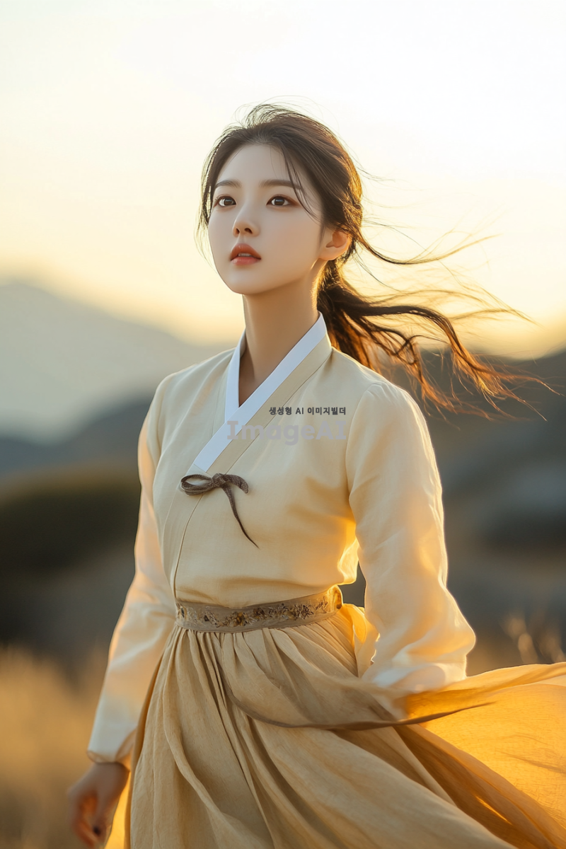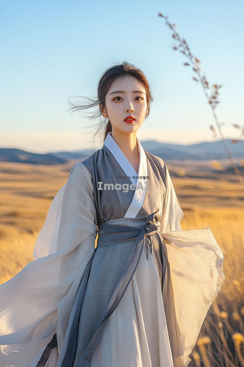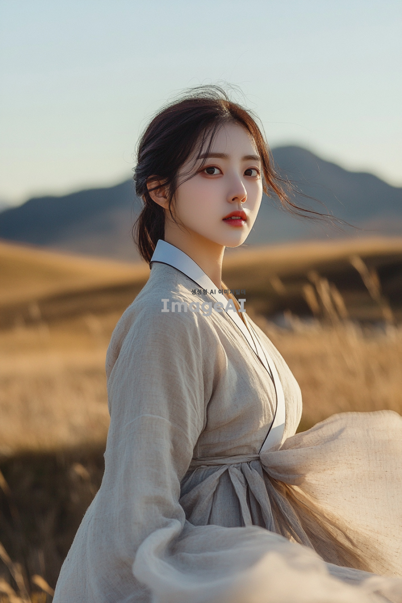젊고 매력적인 20대 한국 여성이 한국의 전통적인 복식을 재해석한 옷을 입고, 산맥, 초원, 언덕, 광활한 평야의 아름다운 풍경을 배경으로 서 있는 모습. 여성의 표정은 자신감 넘치고 자연과 조화롭게 어우러지는 느낌을 주며, 바람에 흩날리는 옷자락과 함께 자연의 웅장함을 강조하는 장면.