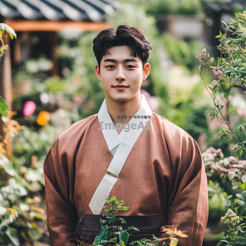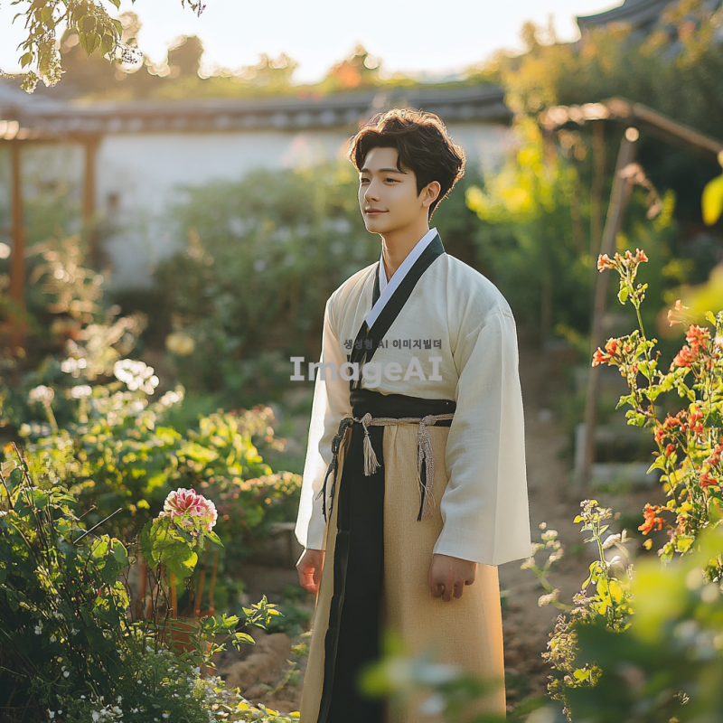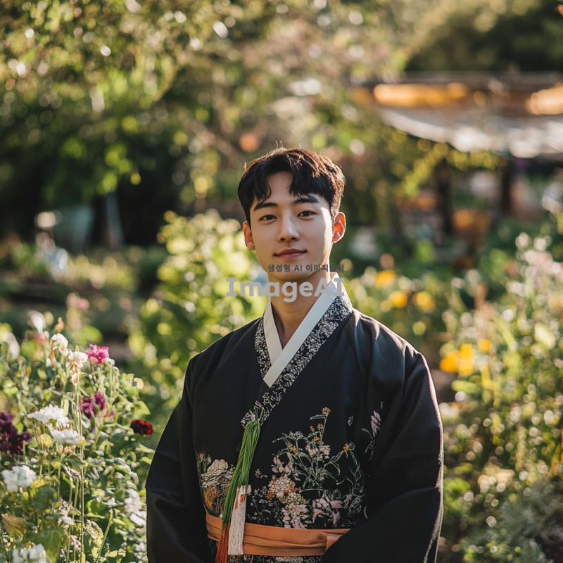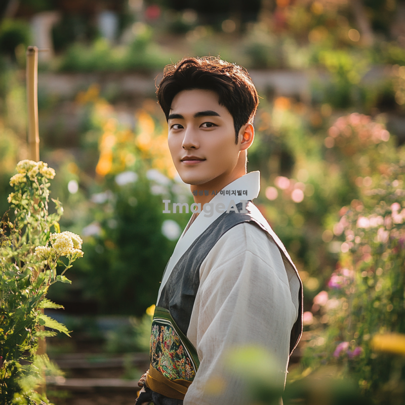젊고 매력적인 20대 남성이 전통적 한국 복식을 재해석한 옷을 입고, 비옥한 농지와 풍요로운 정원을 배경으로 서 있는 모습. 그의 주변에는 푸른 식물과 다양한 꽃들이 만발해 있으며, 햇살이 따뜻하게 비추고 있어 생동감 넘치는 분위기를 자아낸다. 남성의 표정은 자신감 있고 행복해 보이며, 자연과 조화를 이루는 느낌을 강조한다.