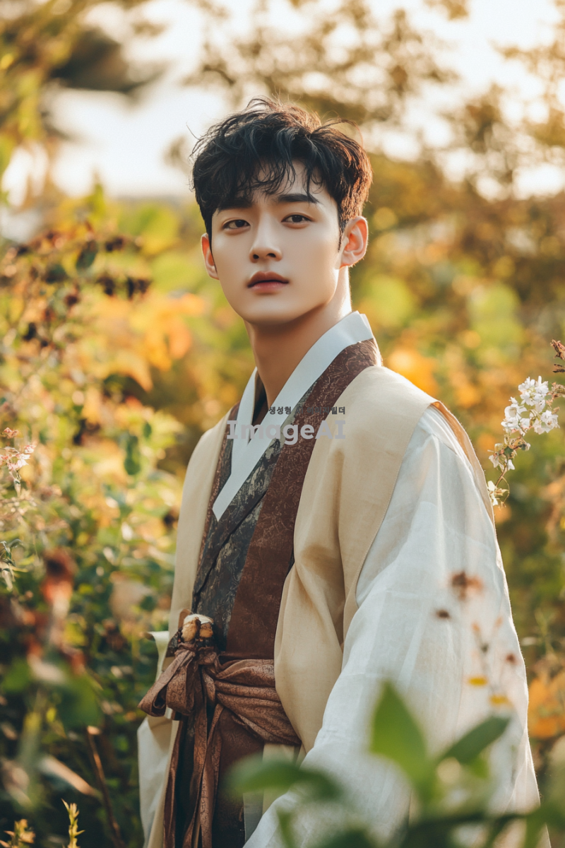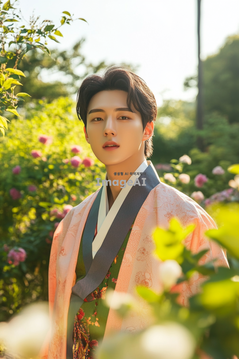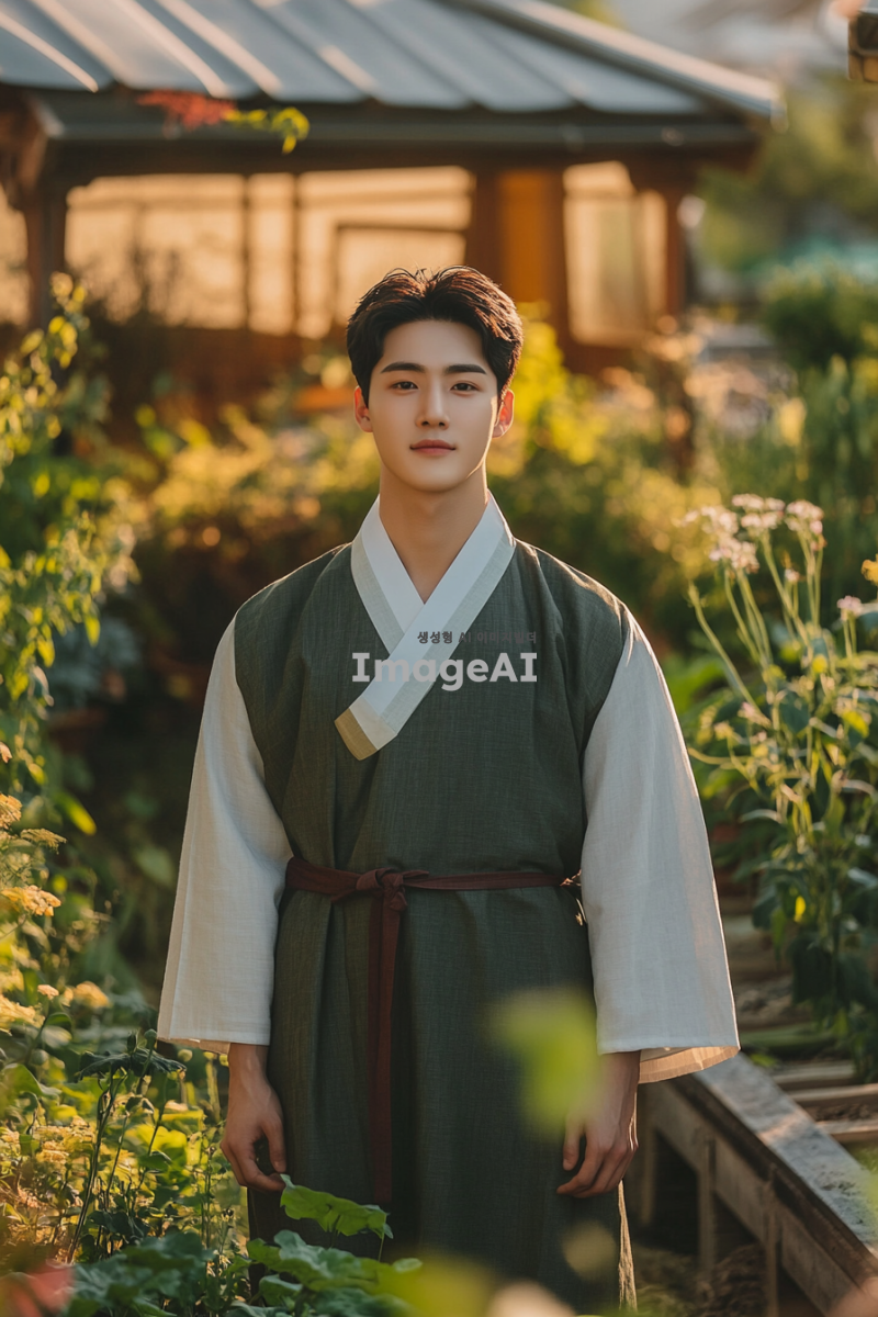 젊고 매력적인 20대 한국 남성이 전통적인 한국 복식을 현대적으로 재해석한 의상을 입고, 비옥한 농지와 풍요로운 정원을 배경으로 서 있는 모습. 그의 주변에는 푸른 식물과 다양한 꽃들이 만발해 있으며, 따뜻한 햇살이 비추어 생동감 넘치는 분위기를 자아낸다. 남성의 표정은 자신감 있고 행복해 보이며, 자연과 조화를 이루는 느낌을 강조한다.