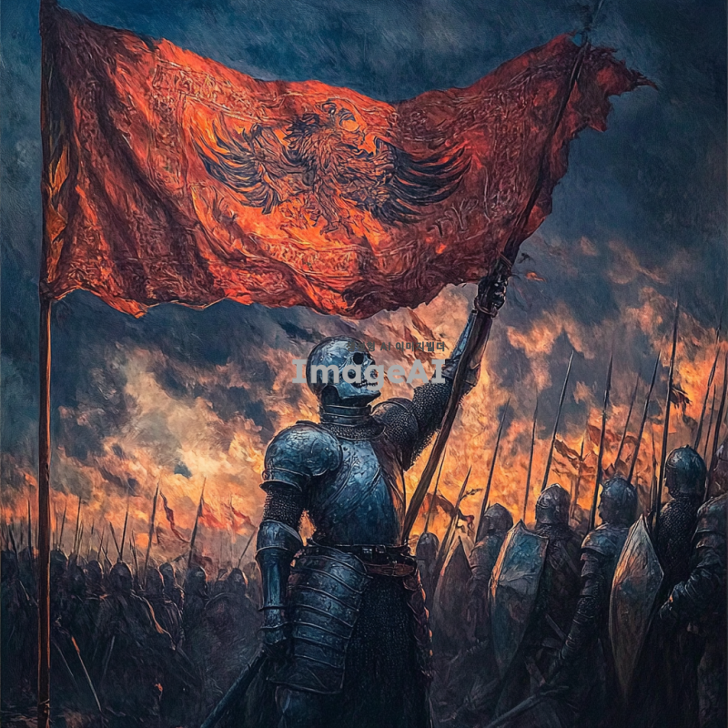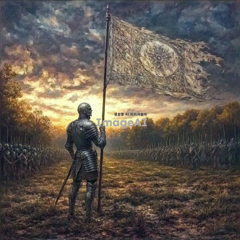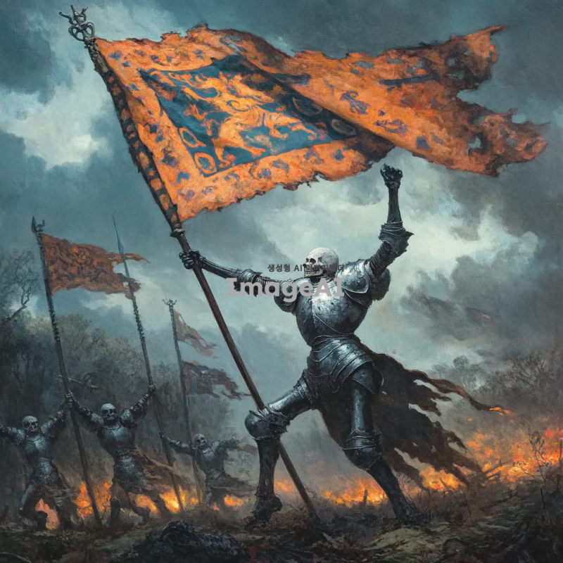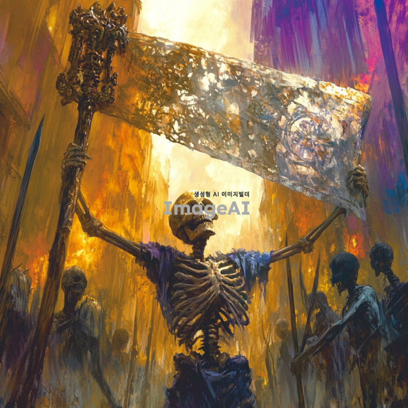백골 전사가 승리의 깃발을 힘차게 들고 있는 모습. 전투의 여파가 느껴지는 전장 배경, 해가 지는 황혼의 하늘이 장관을 이루고 있다. 백골 전사는 갑옷을 입고 있으며, 전투의 상처가 있는 모습. 그의 표정은 승리의 기쁨으로 가득 차 있다. 깃발은 화려한 문양이 새겨져 있으며, 바람에 펄럭이고 있다. 주변에는 전투에서 승리한 동료들이 함께하고 있는 모습도 담겨 있다.