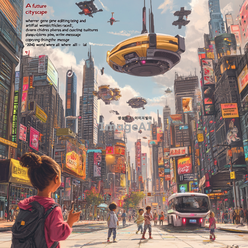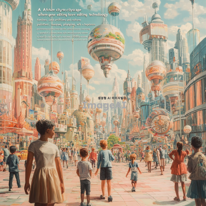 "미래의 도시 풍경, 유전자 편집 기술과 인공 자궁이 발전하여 행복한 가족들이 함께하는 모습, 다양한 인종과 문화가 어우러진 아이들이 뛰어노는 장면, 희망적이고 따뜻한 색감, '2040, 모든 생명이 가능해지는 세상'이라는 메시지"