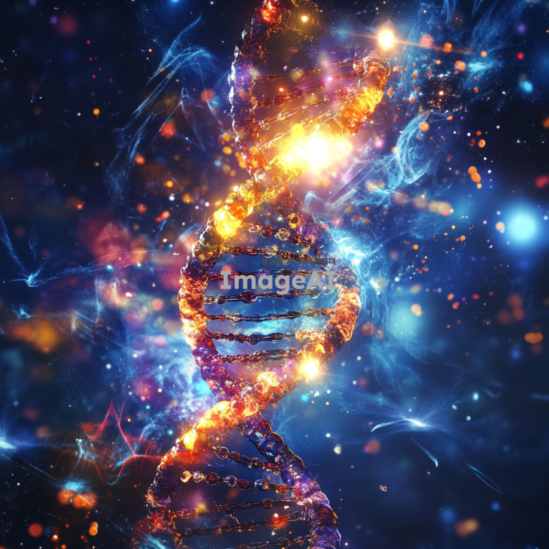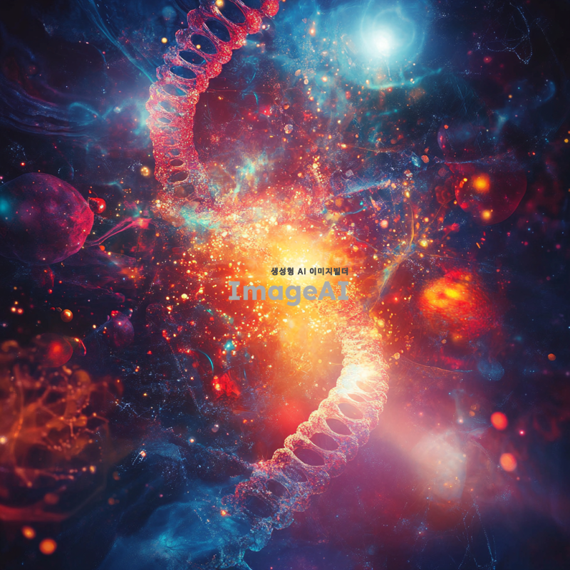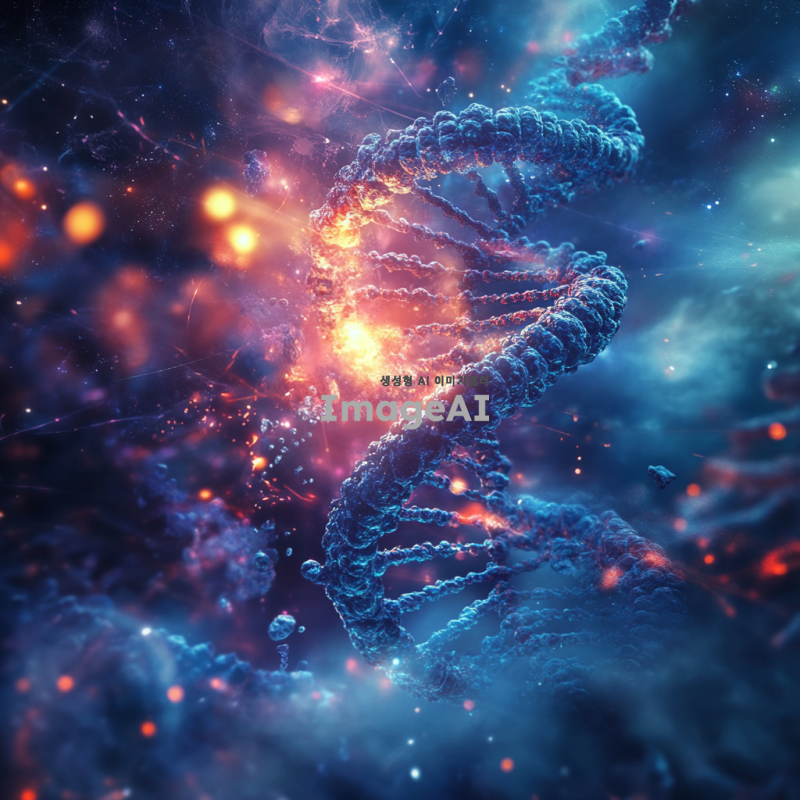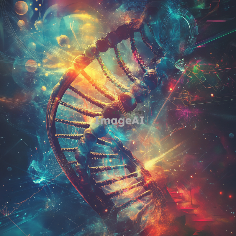 미래 지향적인 느낌의 그래픽으로, DNA와 세포가 융합되어 생명이 탄생하는 순간을 포착한 이미지. 신비로운 색조와 빛의 효과로 생명의 에너지를 강조하며, 배경은 우주적이고 추상적인 요소들로 가득 차 있어 시청자의 호기심을 자극하는 썸네일 디자인.