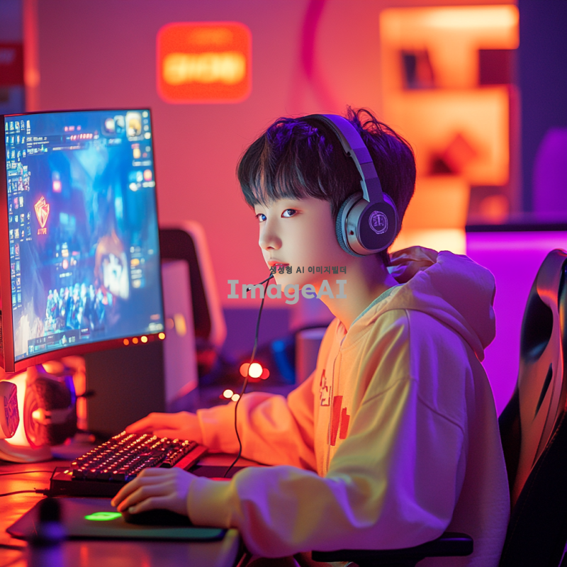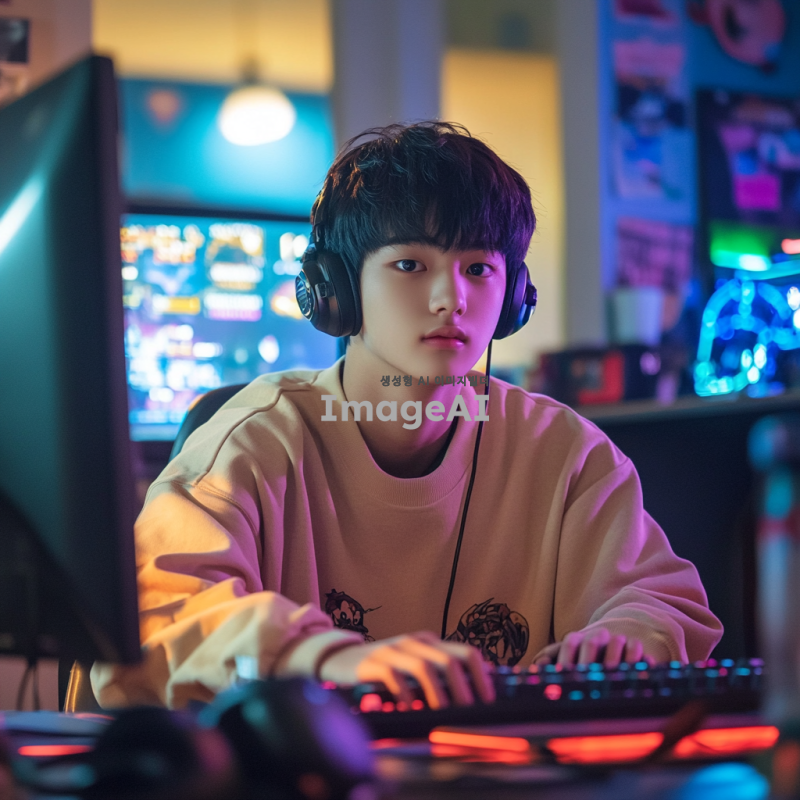온라인 게임을 플레이하고 있는 10대 남자, 밝은 방 안에서 컴퓨터 앞에 앉아 집중하고 있는 모습, 화면에는 다양한 온라인 게임과 모바일 게임의 로고가 떠있음, 캐주얼한 옷을 입고 헤드셋을 착용하고 있으며, 주변에는 게임 관련 소품들이 놓여 있음, 활기찬 분위기, 한국의 젊은 남성의 특징을 잘 표현, 생동감 넘치는 색감