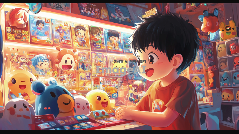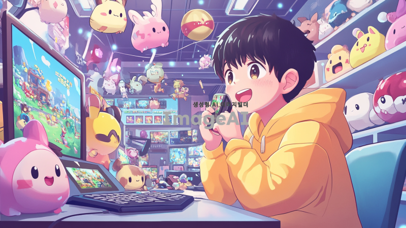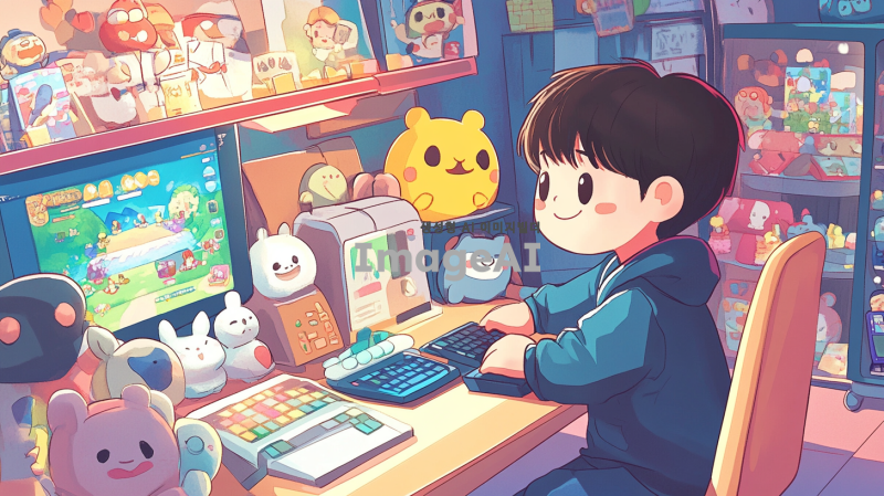 10대 한국 남자가 다양한 온라인 게임을 찾고 있는 장면을 귀여운 애니메이션 스타일로 표현. 배경은 아기자기한 게임 캐릭터와 아이템들로 가득 차 있으며, 남자는 신나는 표정으로 게임들을 바라보고 있다. 게임 캐릭터들이 주변에 흩어져 있어 활기찬 분위기를 연출하고, 색감은 밝고 경쾌하게 설정. 가로 1080px, 세로 340px 사이즈로 구성.