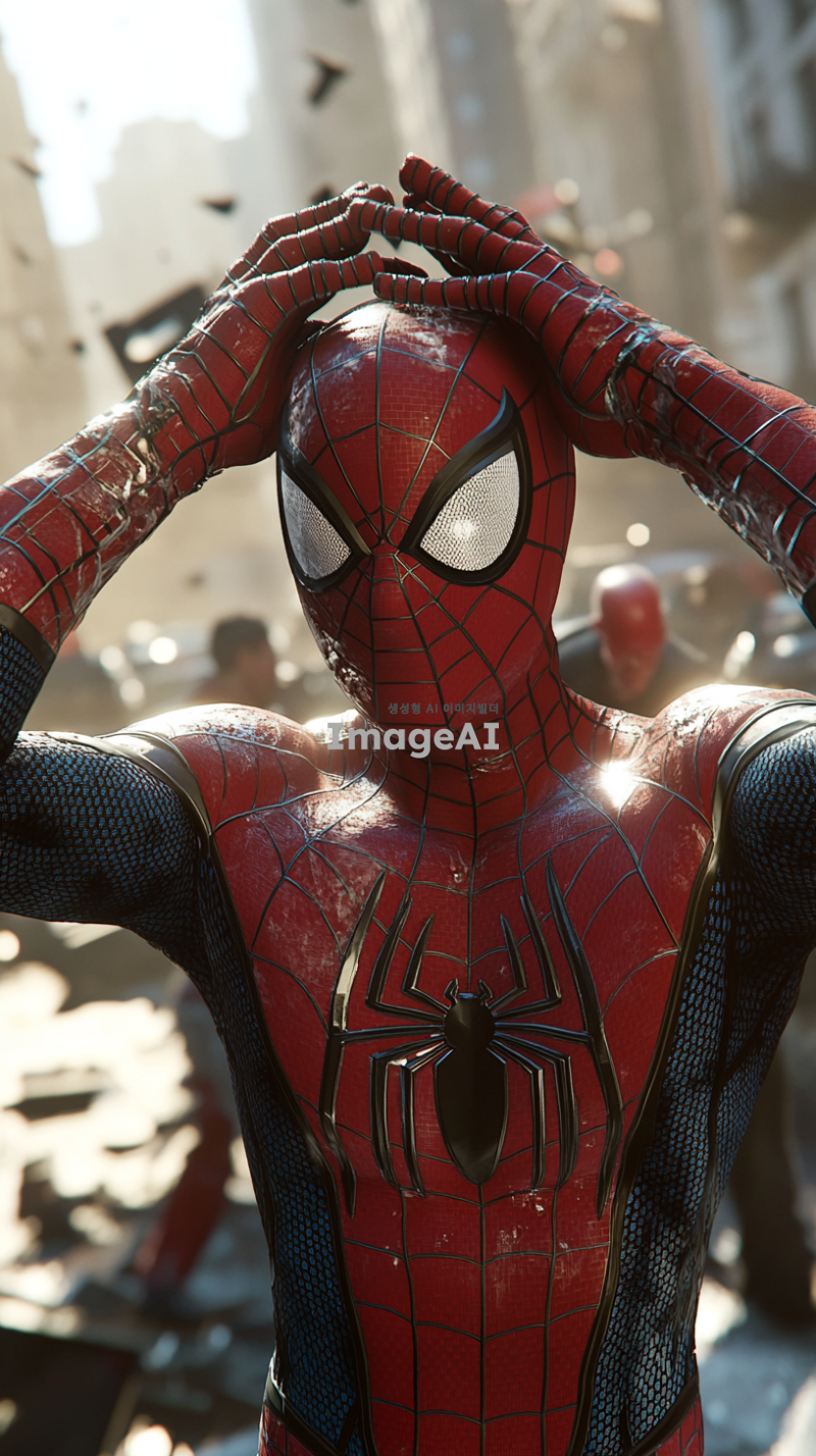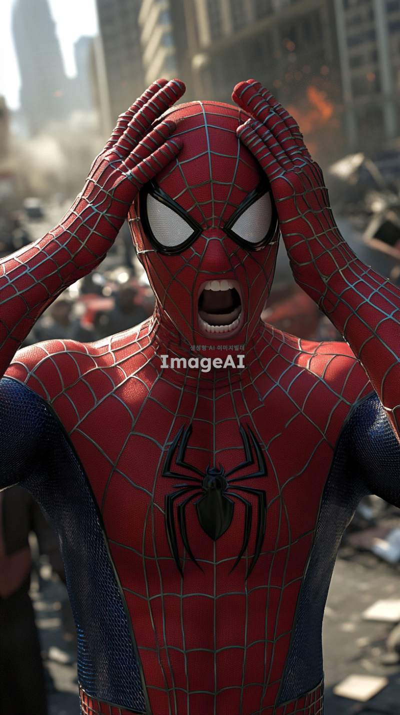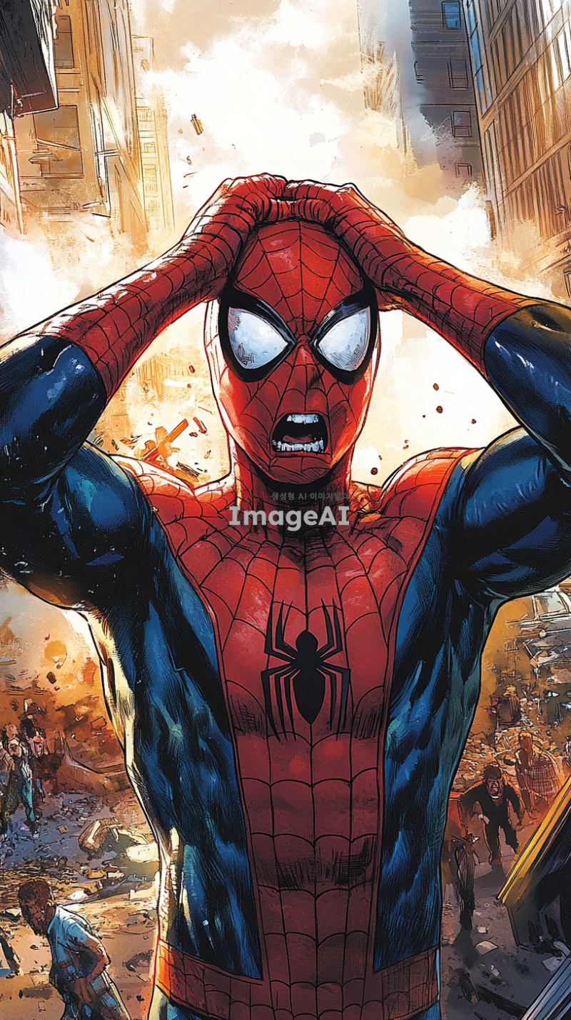 스파이더맨이 슈트를 입고 복면을 쓴 채로 양손을 머리에 얹고 당황 하고 있는 모습. 배경에는 사건이 발생한 듯한 혼란스러운 도시 풍경이 펼쳐져 있으며, 파편과 연기가 가득한 거리, 사람들의 놀란 표정이 보인다. 스파이더맨의 자세는 긴장감이 느껴지며, 주변의 긴박한 상황이 강조되어 있다.