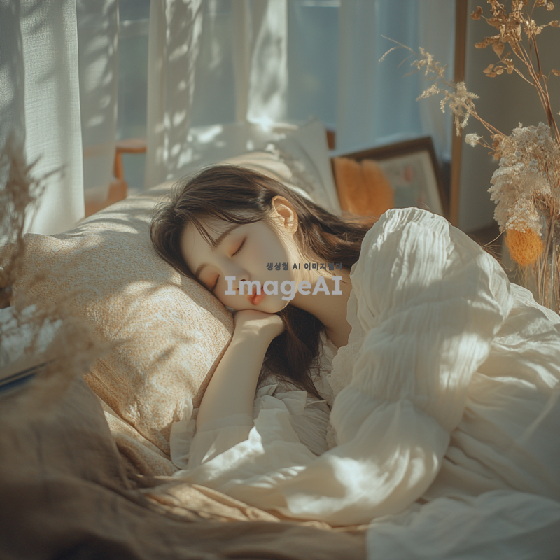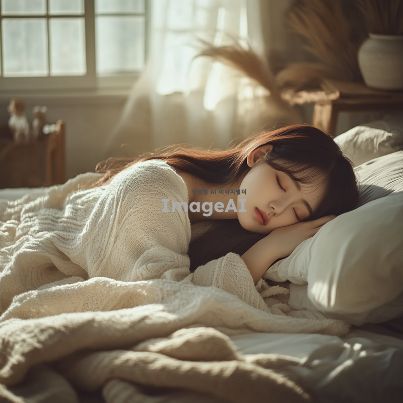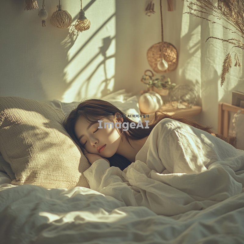 아름다운 한국 여성이 편안하게 자고 있는 모습, 전신이 잘 드러나도록, 부드러운 자연광이 비추는 방 안에서, 아늑한 침대 위에 누워 있는 모습, 포근한 이불과 아기자기한 인테리어 소품들이 있는 장면.