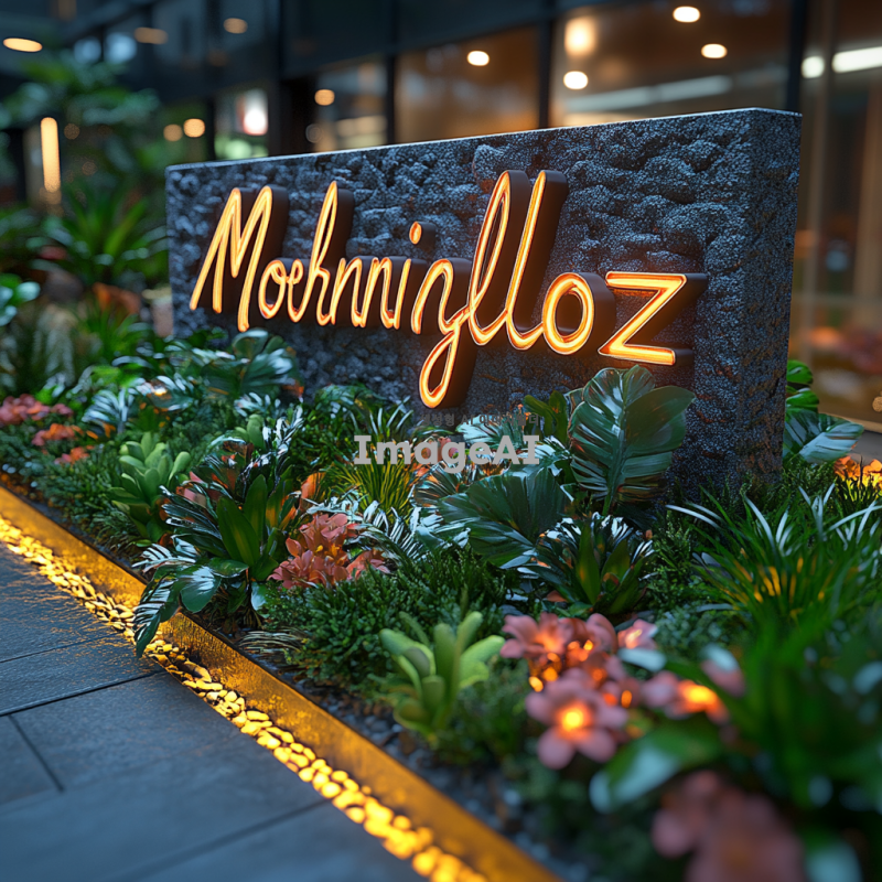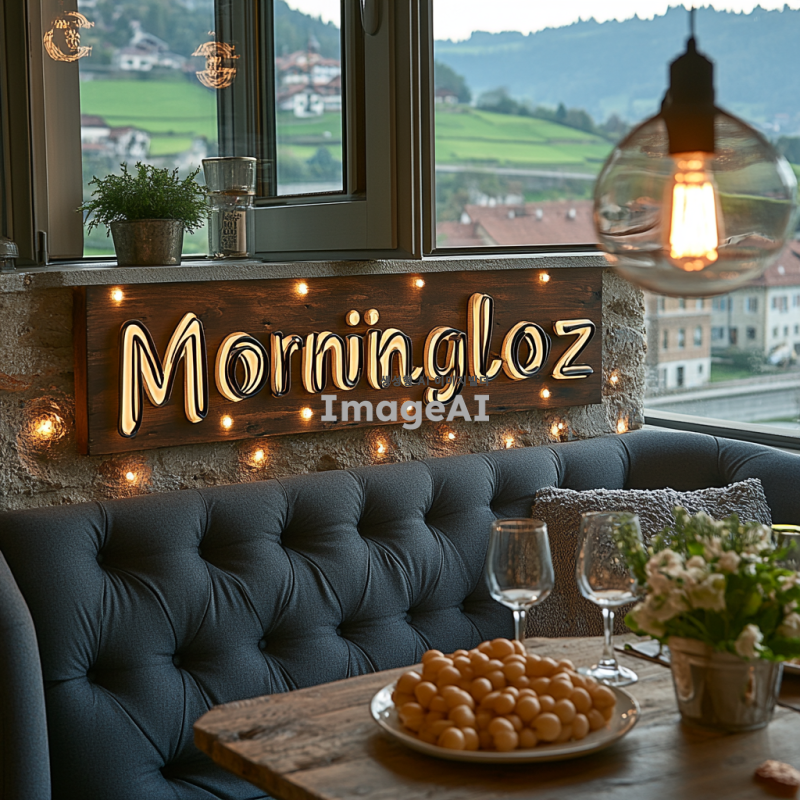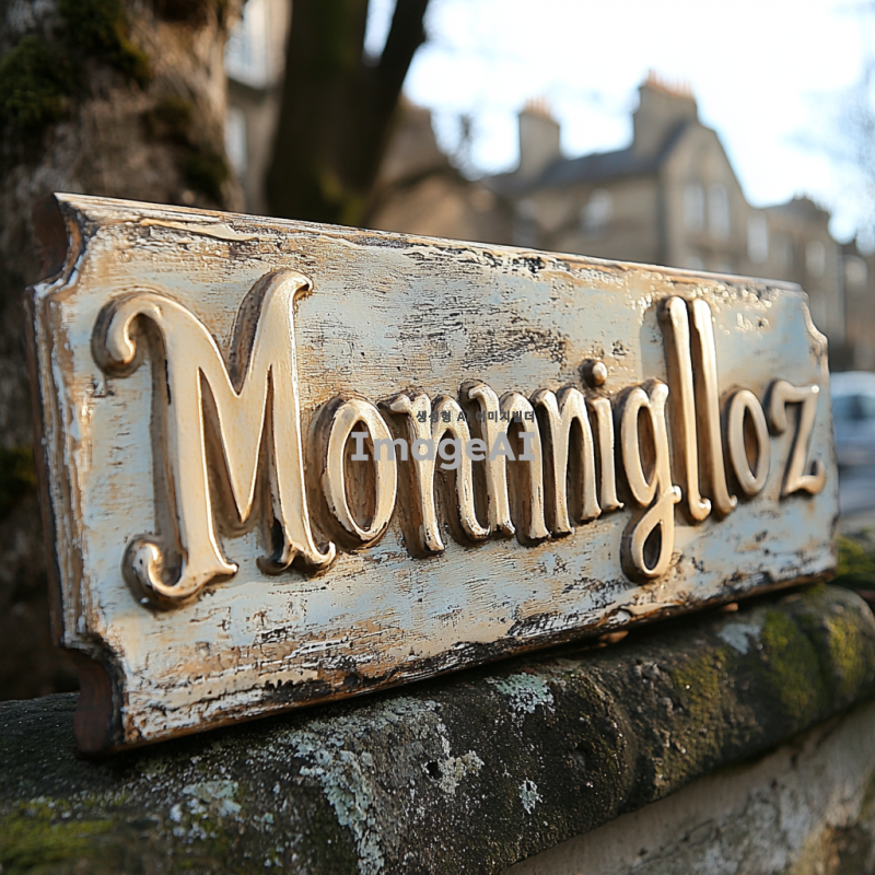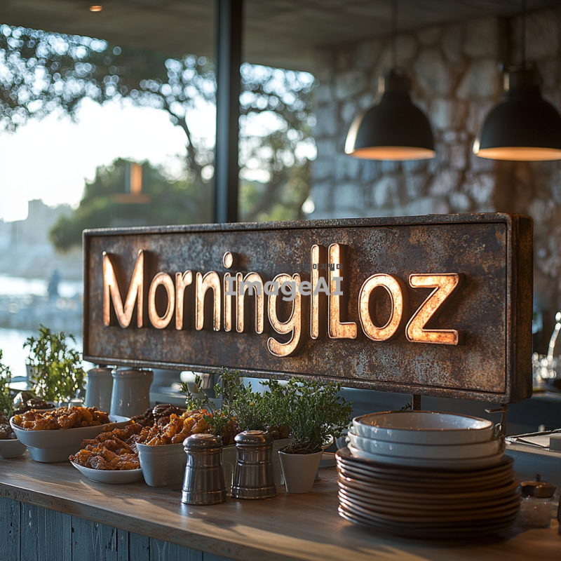 아침 햇살 아래 빛나는 간판, 'Morningloz'라는 글씨가 세련된 서체로 디자인된 모습. 간판은 현대적이고 감각적인 스타일로, 주변에는 아침 풍경이 어우러져 있어 자연의 따뜻한 느낌이 가득한 장면. 간판의 색상은 부드러운 파스텔 톤으로, 아침의 상쾌함을 느낄 수 있도록.