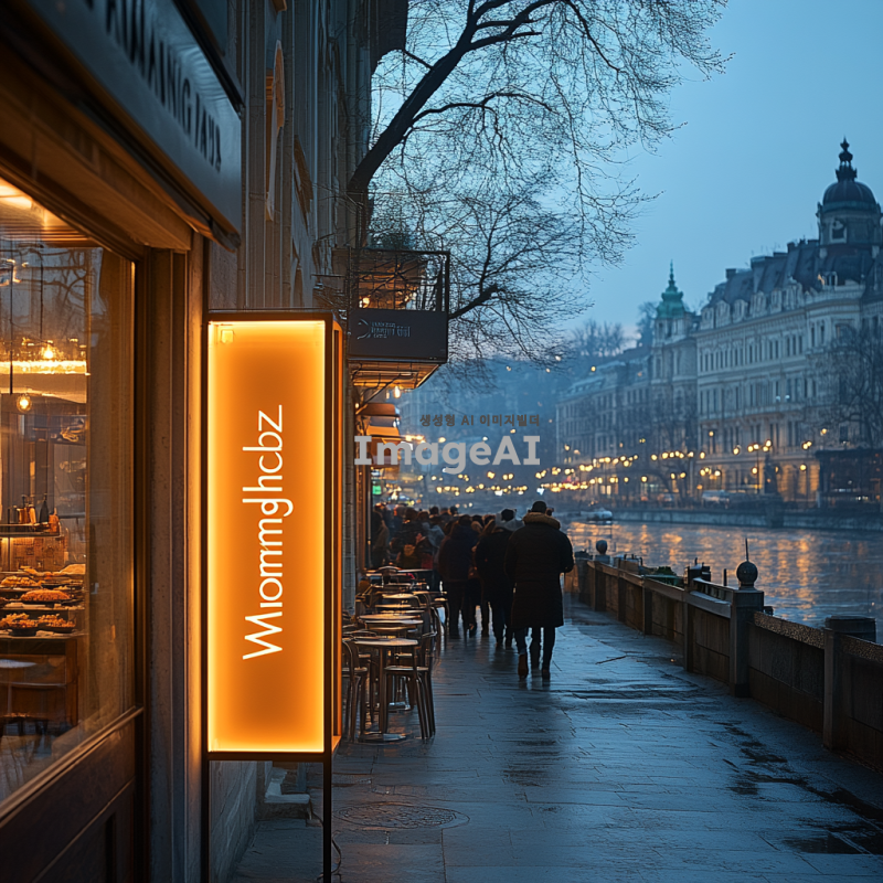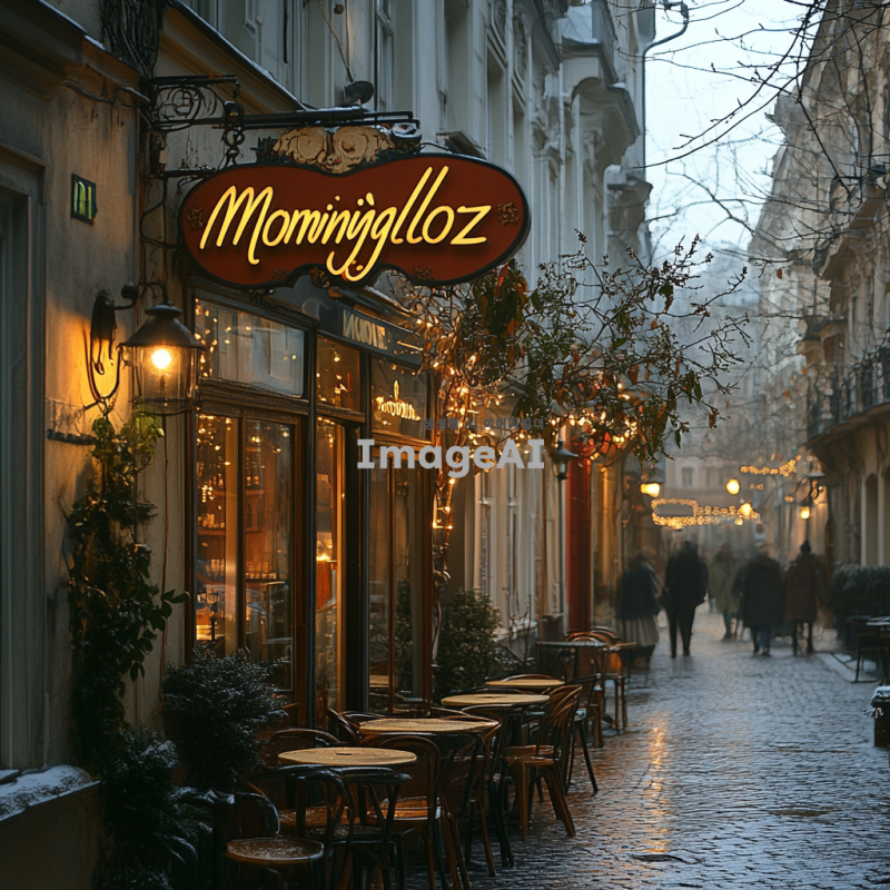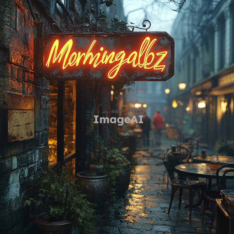 아침 햇살이 비치는 거리에서 'Morningloz'라는 글자가 세련되게 디자인된 간판이 앞면에 보이는 장면. 간판은 현대적인 느낌을 주며, 따뜻한 색조로 아늑한 분위기를 연출하고 주변에는 커피숍과 아침 식사를 즐기는 사람들의 모습이 보인다. 배경은 도시의 아침 풍경으로, 푸른 하늘과 함께 여유로운 일상이 담겨 있다.