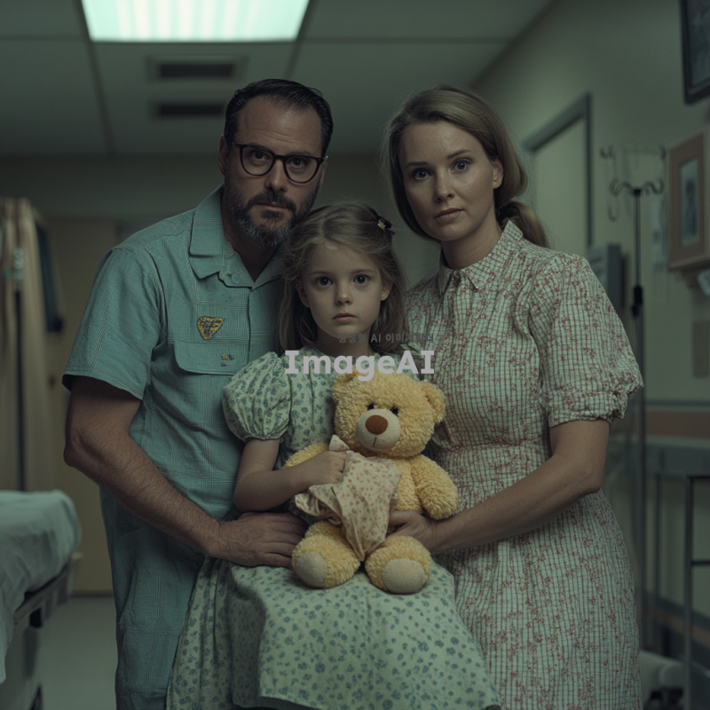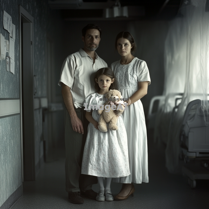 엄마, 아빠, 여자아이로 구성된 가족사진이 필요해. 여자아이는 환자복을 입고 곰인형을 안고 있어. 사진 배경은 병원에서 찍은 듯하고 공포스러운 분위기가 있어
