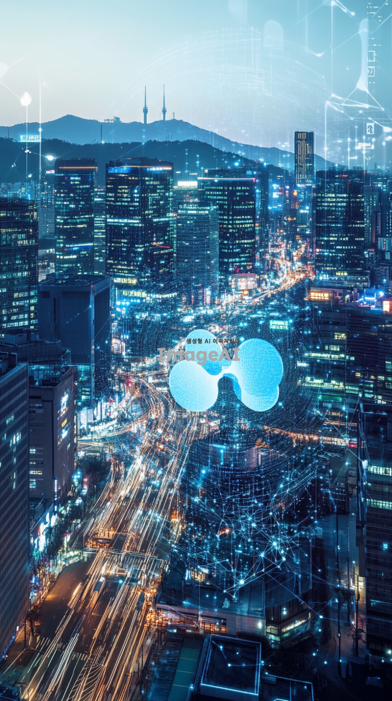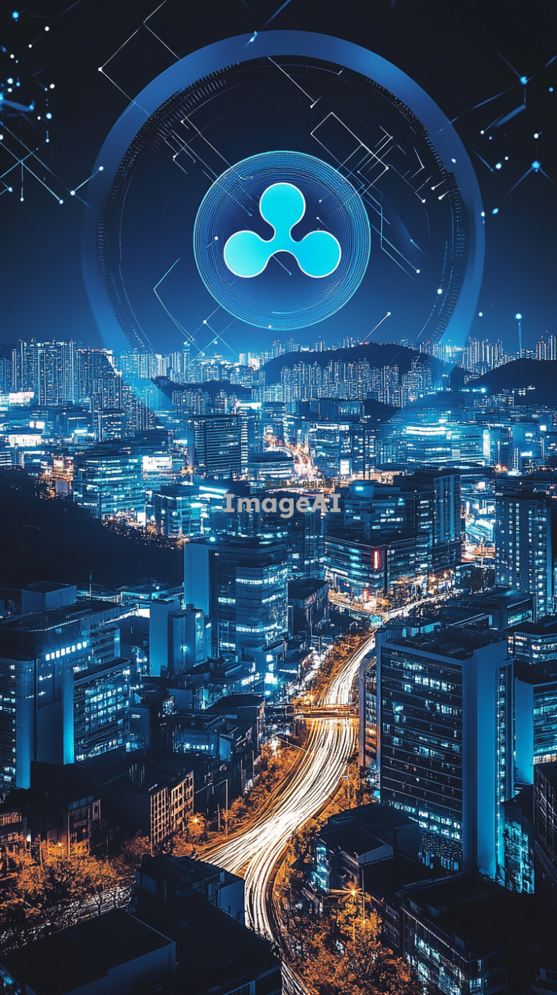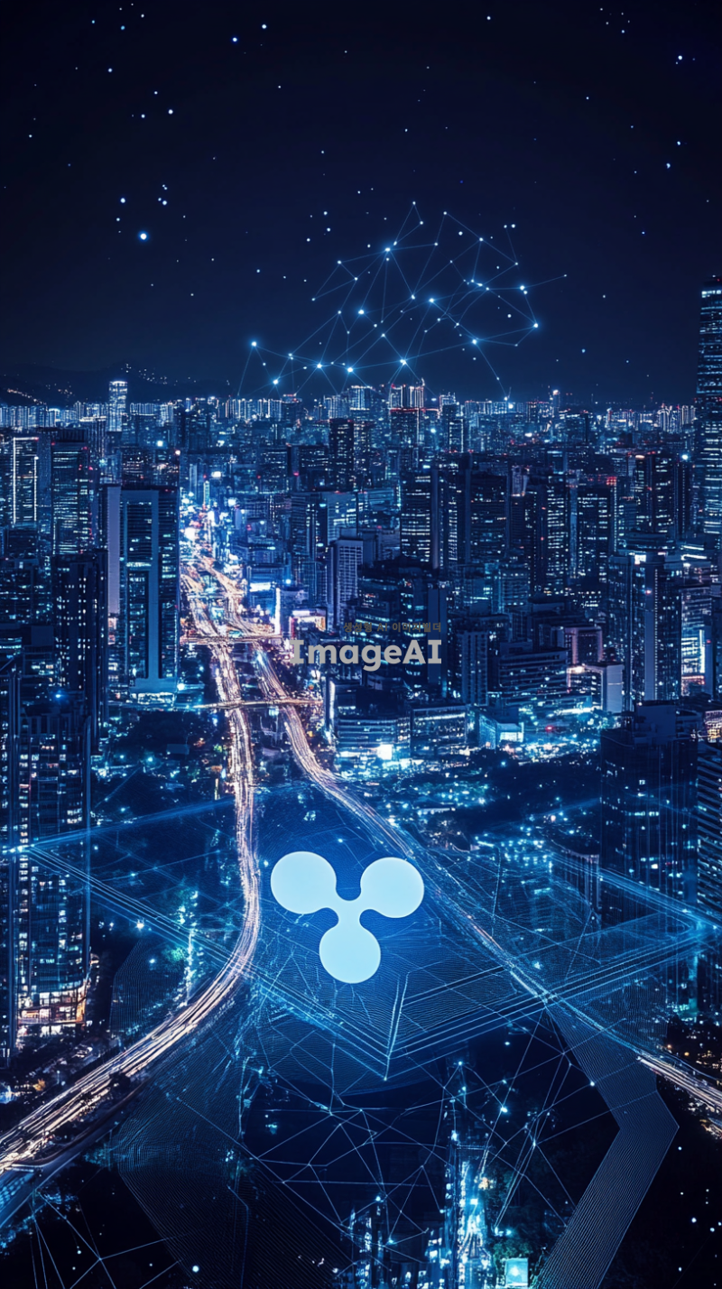 리플 코인을 상징하는 현대적인 디자인의 그래픽, 블루와 화이트 색조를 사용하여 디지털 금융의 미래를 표현, 리플 로고와 함께 블록체인 기술을 시각적으로 나타내는 요소들 포함, 한국의 도시 풍경을 배경으로 하여 리플 코인의 글로벌한 영향력을 강조, 세련되고 혁신적인 느낌을 주는 스타일.
