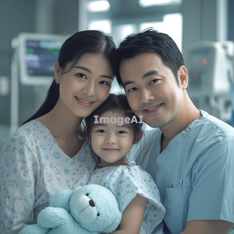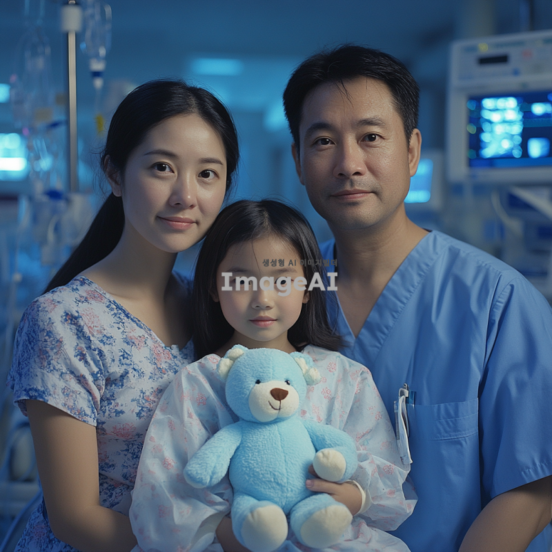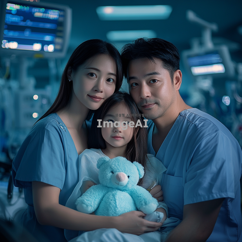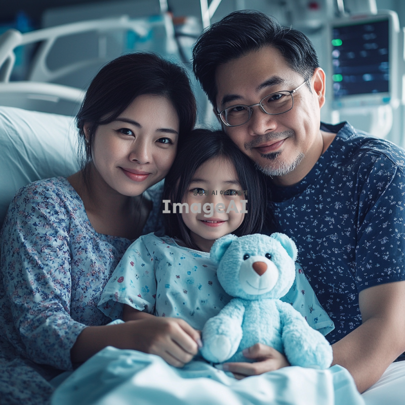 엄마, 아빠, 여자아이로 구성된 가족사진이 필요해. 여자아이는 환자복을 입고 곰인형을 안고 있어. 사진 배경은 병원에서 찍은 듯하고 공포스러운 분위기가 있어. 가족이 모두 동양인이어야해. 곰돌이 인형을 하늘색으로 해줘