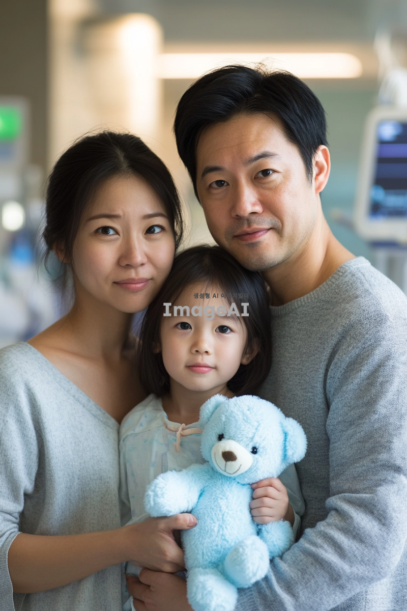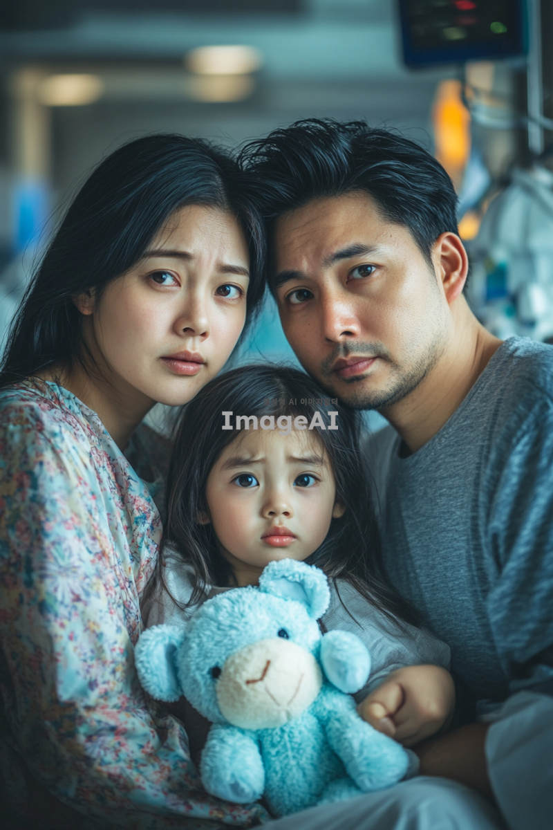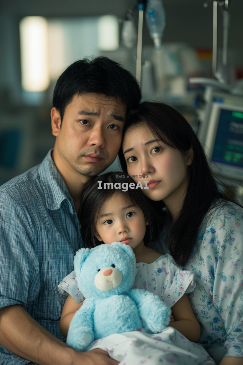 동양인 가족이 병원에서 찍은 가족사진. 엄마와 아빠는 걱정스러운 표정을 짓고 있으며, 여자아이는 환자복을 입고 하늘색 곰인형을 안고 있다. 전체적인 분위기는 공포스럽고 긴장감이 느껴지며, 배경에는 병원의 의료 장비와 차가운 조명이 어우러져 있다.