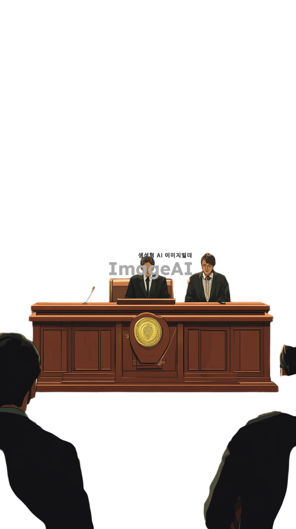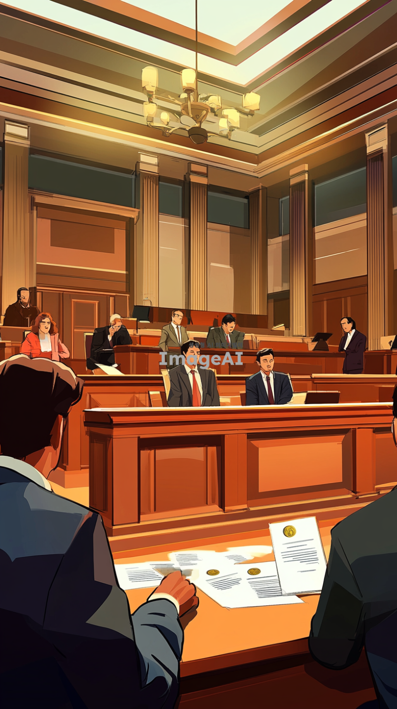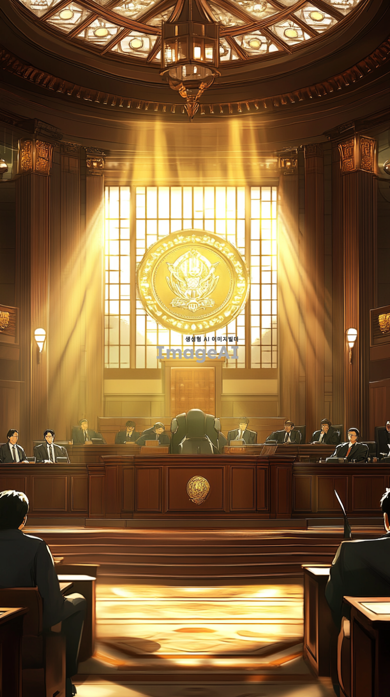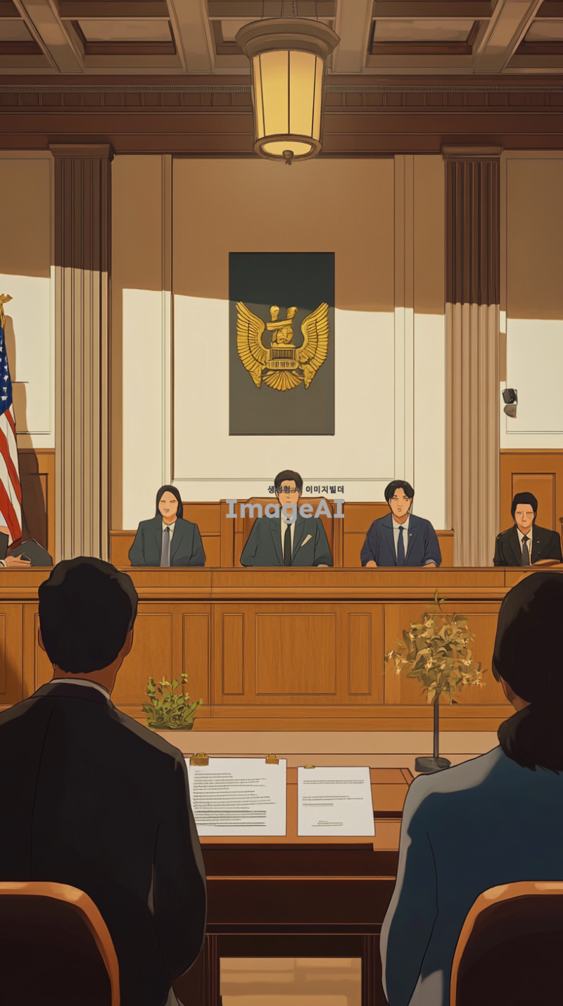 미국의 법원에서 코인 소송을 진행하는 모습, 법정에서 변호사와 원고가 소통하는 장면, 밝고 희망적인 분위기, 법정의 정교한 디자인과 조명, 주변에 코인 관련 자료와 서류가 놓여 있는 모습, 한국의 전통적인 요소가 가미된 현대적인 법정 환경, 긍정적인 결과를 기대하는 표정의 인물들.
