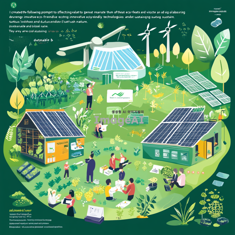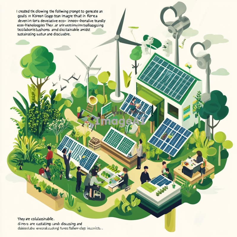 "푸른 자연 속에서 혁신적인 친환경 기술을 개발하는 한국의 스타트업 팀. 그들은 태양광 패널과 풍력 발전기를 배경으로, 지속 가능한 비즈니스 모델을 논의하며 서로 협력하고 있다. 주변에는 다양한 식물과 나무가 자생하고 있으며, 지역 주민들이 함께 참여하여 녹색 일자리를 창출하는 모습이 담겨 있다. 밝고 희망적인 분위기, 미래 지향적인 디자인, 탄소중립을 향한 열정이 느껴지는 장면."