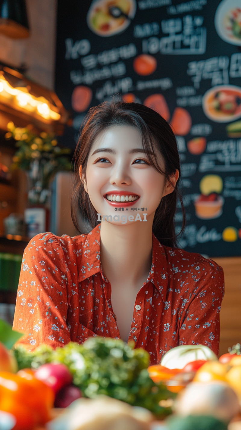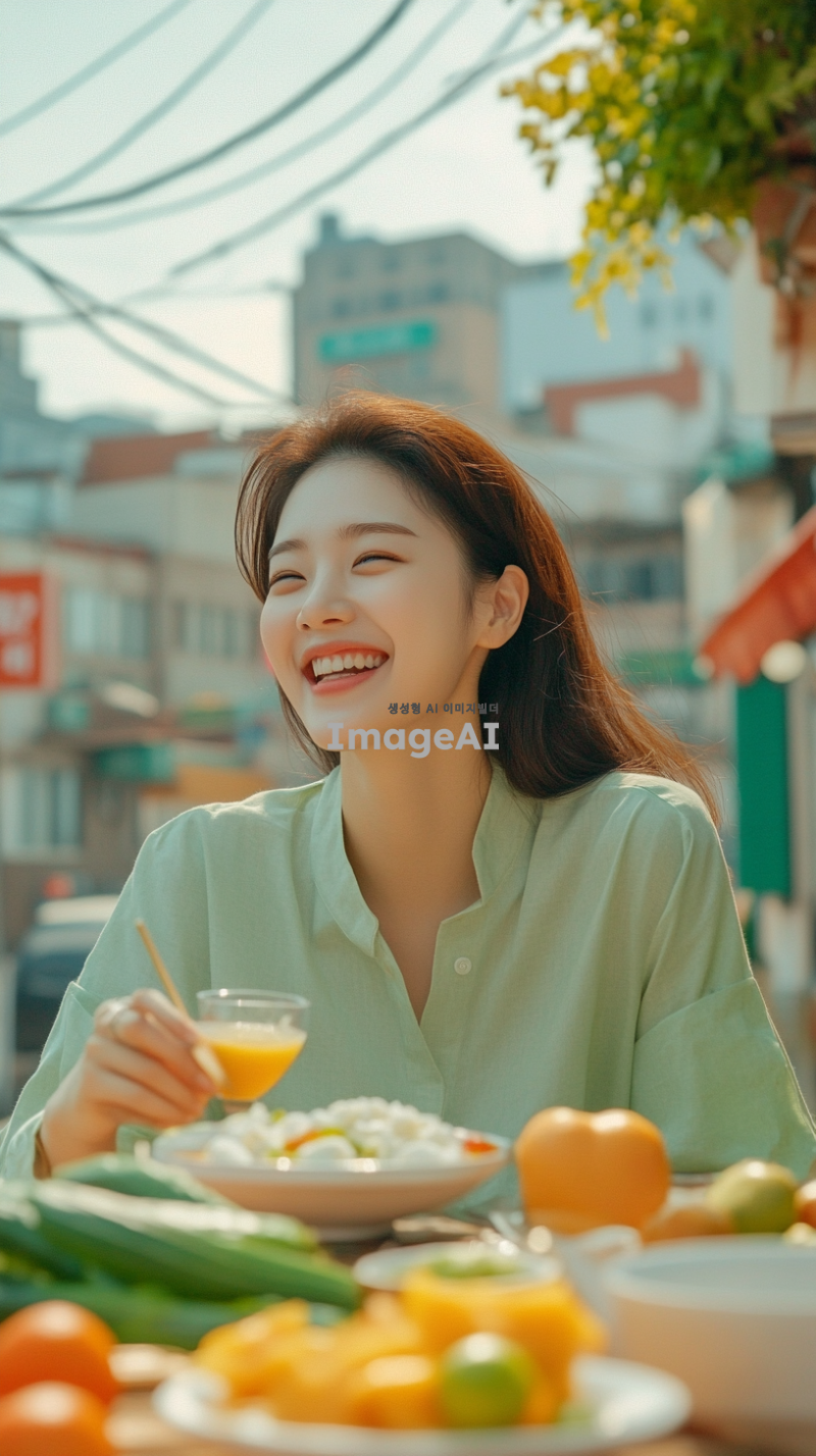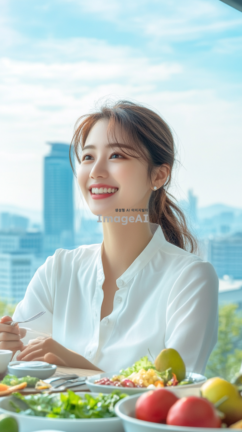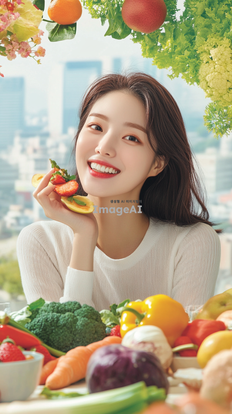 한국의 도시 배경에서 건강한 식단을 즐기는 젊은 한국인 여성의 모습, 신선한 과일과 채소가 가득한 테이블 앞에서 웃으며 식사하는 장면, 다이어트와 건강한 라이프스타일을 강조하는 메시지가 담긴 포스터 디자인, 밝고 생기 있는 색상 사용, 동기부여가 되는 문구 포함, 현대적이고 세련된 느낌의 레이아웃.