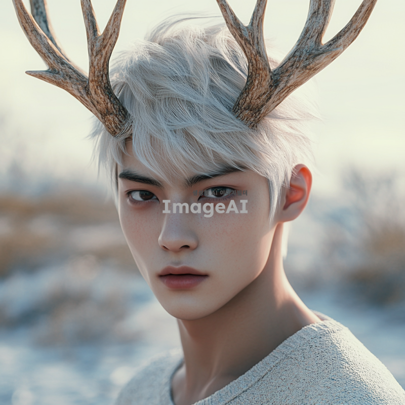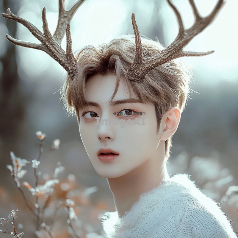 일본인 남성 보이그룹 멤버의 이미지를 생성해 주세요. 이 멤버는 사슴의 특징을 가진 모습으로, 일본의 연예인 사카구치 켄타로와 한국의 연예인 라이즈 소속 정성찬의 외모가 조화롭게 섞인 형태입니다. 피부는 하얗고 부드러운 느낌이며, 자연스러운 표정과 포즈를 취하고 있습니다. AI 이미지 느낌이 적고 실제 사진처럼 사실감 있게 표현해 주세요. 배경은 부드러운 자연 풍경으로 설정해 주세요.