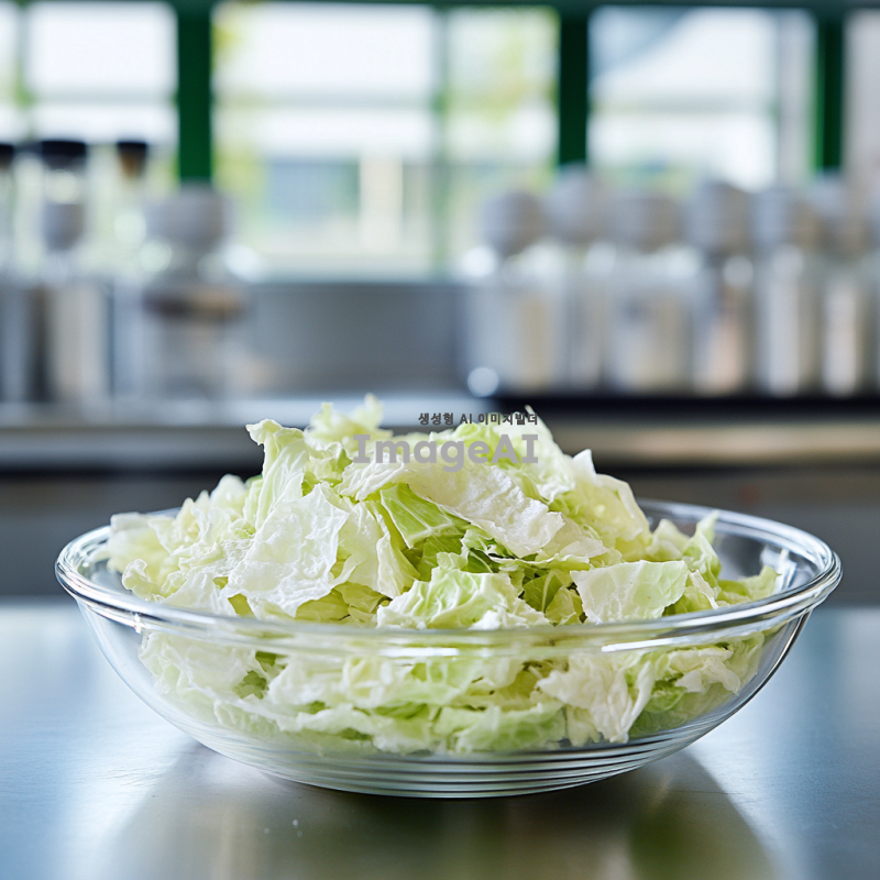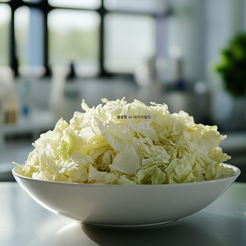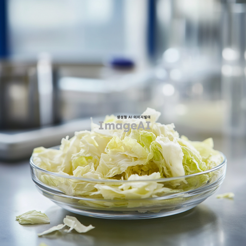 식품 실험을 위해 그릇에 담긴 동결건조된 배추의 이미지, 배경은 실험실 환경으로 설정, 깨끗하고 정돈된 느낌, 조명이 밝고 자연스럽게 비추는 모습, 배추의 질감과 색상이 잘 드러나도록 상세하게 표현.