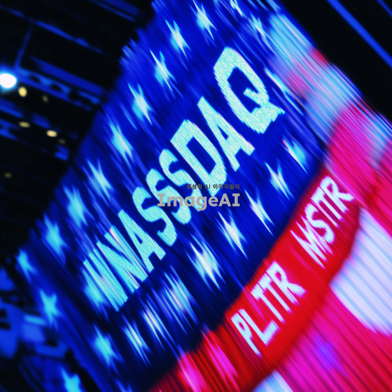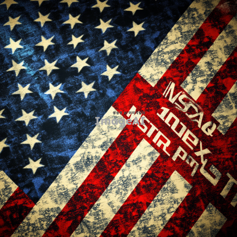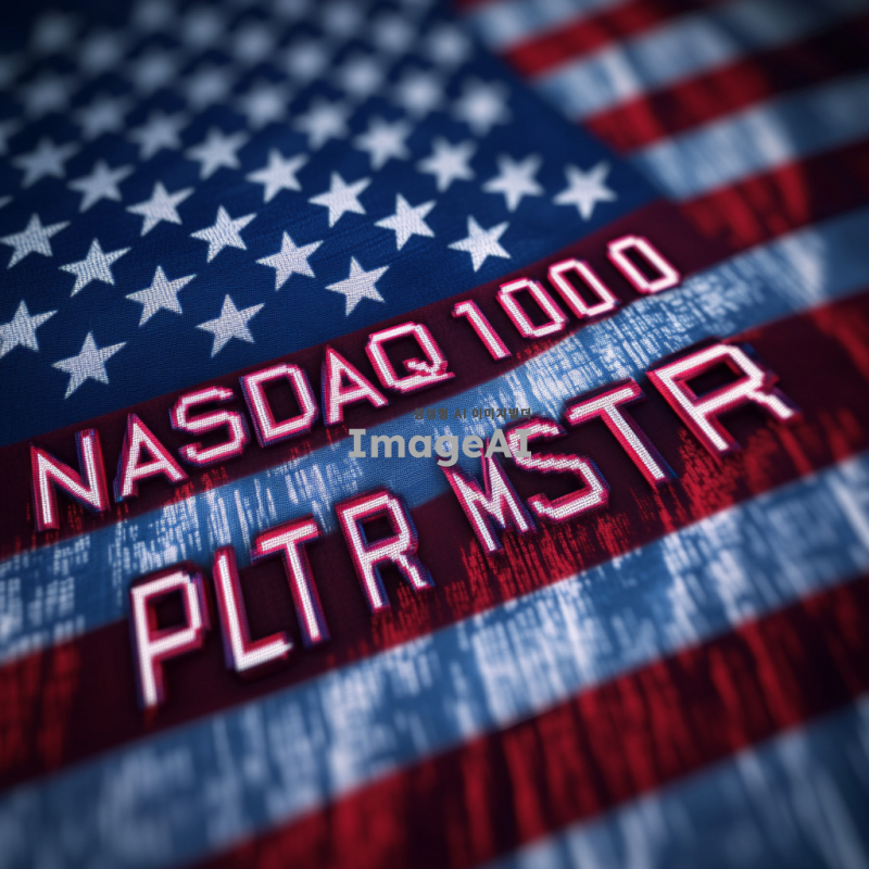 미국 국기를 배경으로 중앙에 "나스닥100지수"라는 글자가 크게 써져 있고, 양쪽에는 "MSTR"과 "PLTR"이라는 단어가 서로 대립하는 형태로 배치된 이미지. 미국 국기의 색상과 디자인이 뚜렷하게 드러나도록 하고, 각 단어는 강렬한 대비를 이루며 시각적으로 눈에 띄게 표현.