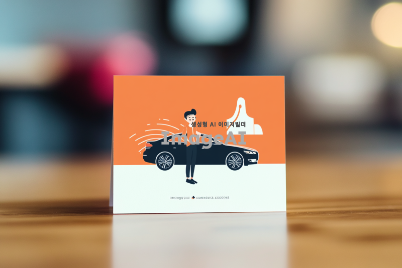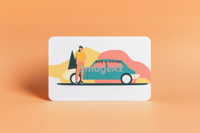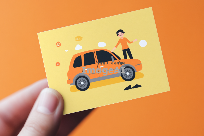 운전면허 학원의 광고 명함, 선생님으로 보이는 사람이 환한 미소를 지으며 자동차 앞에 서있다