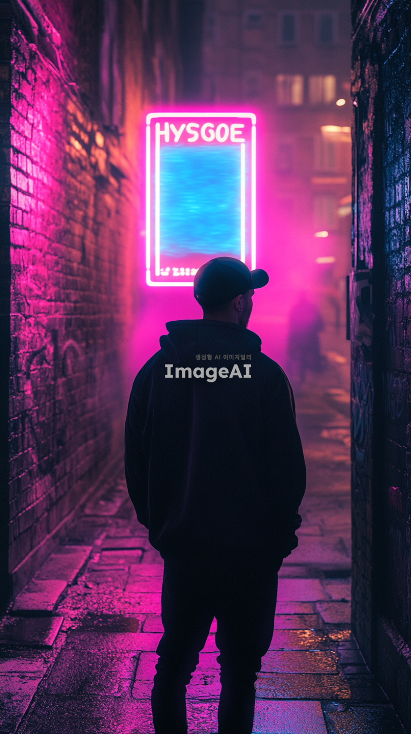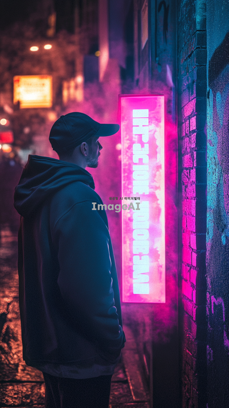 시네마틱, 어반 포토그래피, 어두운 후드를 입고 후드를 올리고 낮은 핏의 모자를 쓴 남자의 뒷모습, 고개를 약간 위로 기울이고 밝은 조명의 포스터를 향해 'Hypstore'라고 적힌 게시판을 향해 중심을 잡았습니다. 밤에 좁은 도심 골목길에 가만히 서 있는 자세, 깨끗하고 미니멀한 미학이 돋보이는 모던 캐주얼 스트리트웨어, (2025), 미디엄 샷이 상반신과 머리를 선명한 초점으로 포착, 생생한 색감과 은은한 질감의 코닥 에카크롬 필름 스톡, 시네마틱 보케를 위한 50mm f/1.2 렌즈의 캐논 EOS R5, (크리스토퍼 놀란에서 영감을 받은 분위기 프레임), 호기심과 조용한 사색의 감정, 젖은 포장도로와 후드의 가장자리를 반사하는 핑크, 블루, 보라색 색조의 네온 조명, 빛나는 하이라이트가 있는 균형 잡힌 생동감 넘치는 컬러 팔레트, 그라피티가 있는 벽돌 벽, 공중에 남아 있는 희미한 안개, 희미하게 빛나는 거리 표지판과 젖은 자갈 바닥처럼 흩어진 디테일이 특징입니다. 빛나는 'Hypestore' 게시판은 부드러운 시네마틱 빛이 주변을 비추는 초점으로 두드러지게 배치되어 남자의 시선을 사로잡았습니다.