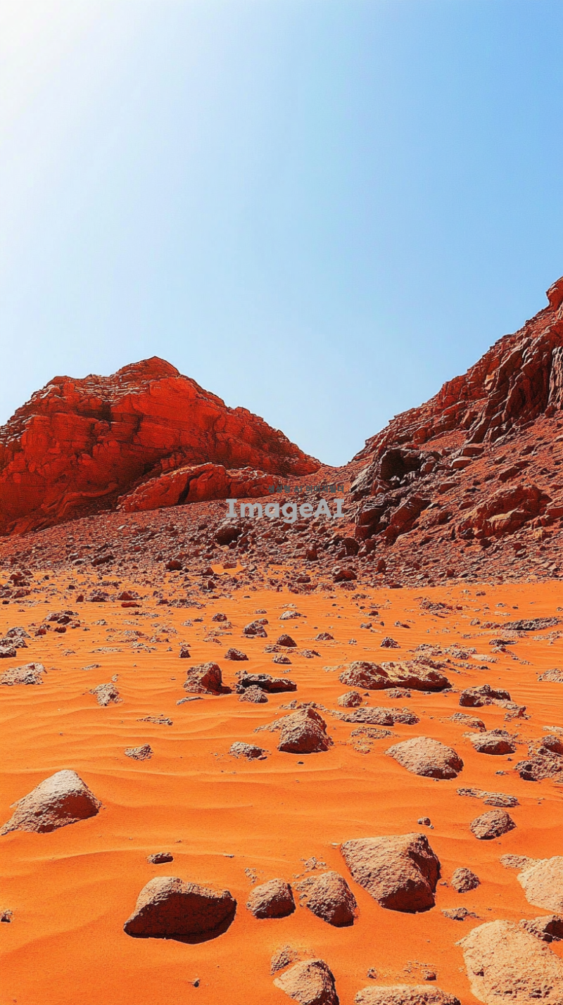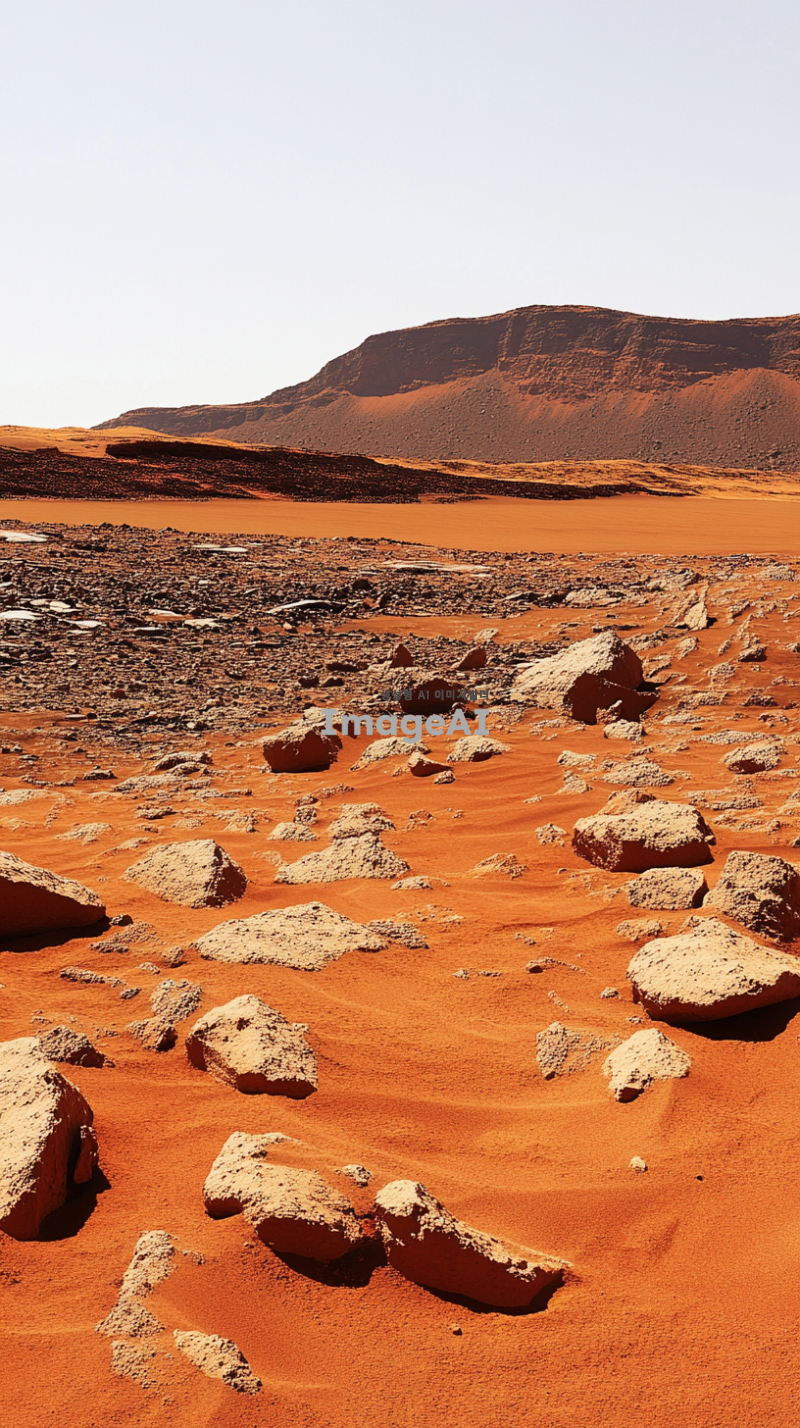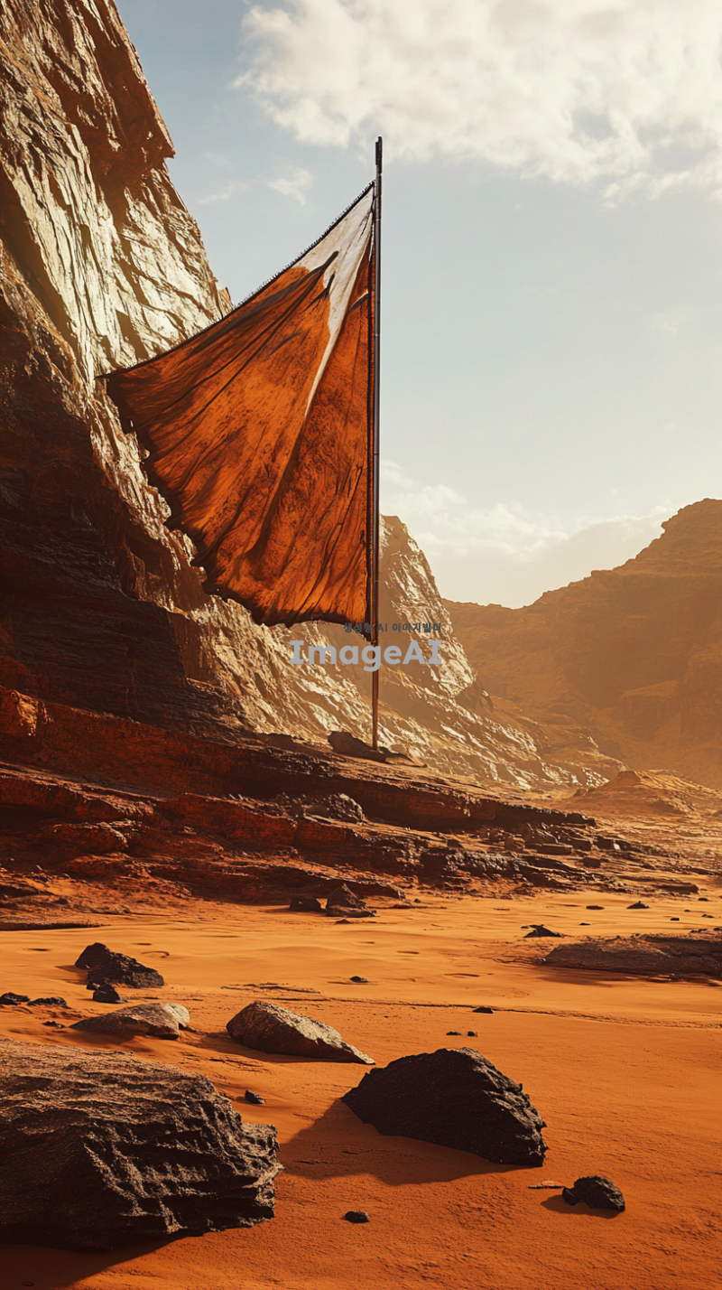 화성의 붉은 풍경 속에 태극기가 휘날리고 있는 모습, 태극기의 색깔과 문양이 선명하게 드러나며, 화성의 특유의 바위와 모래가 배경을 이루는 장면, 맑은 하늘 아래 태극기가 자랑스럽게 서 있는 모습.
