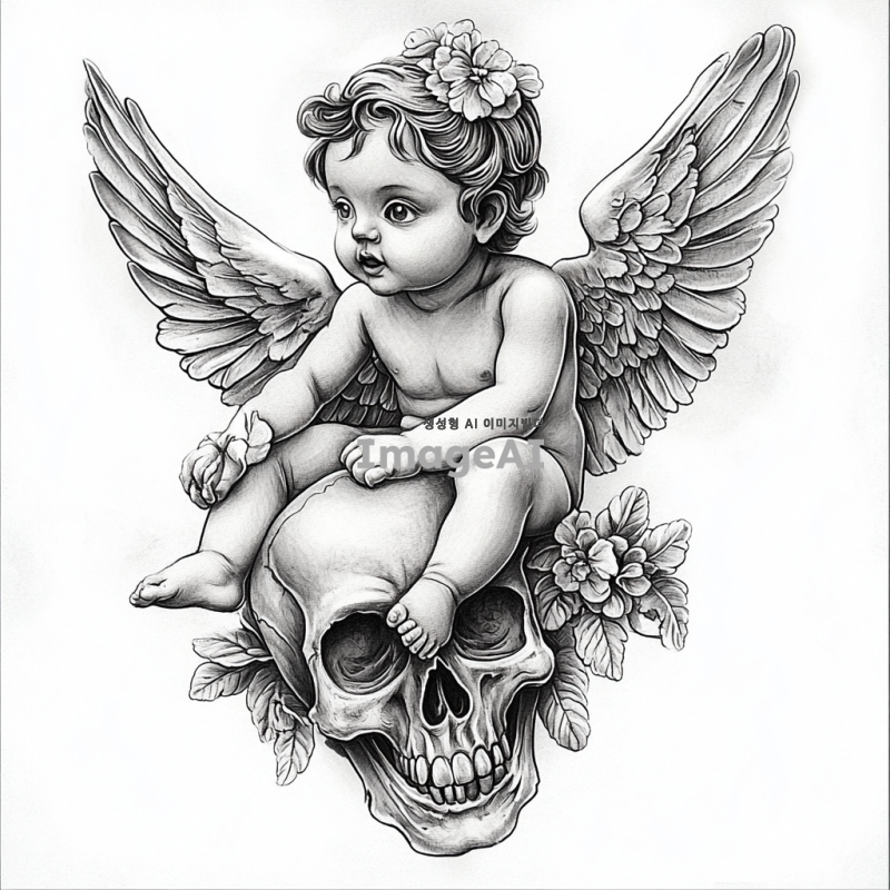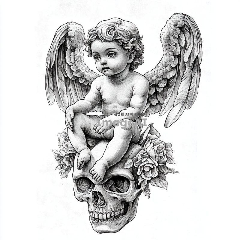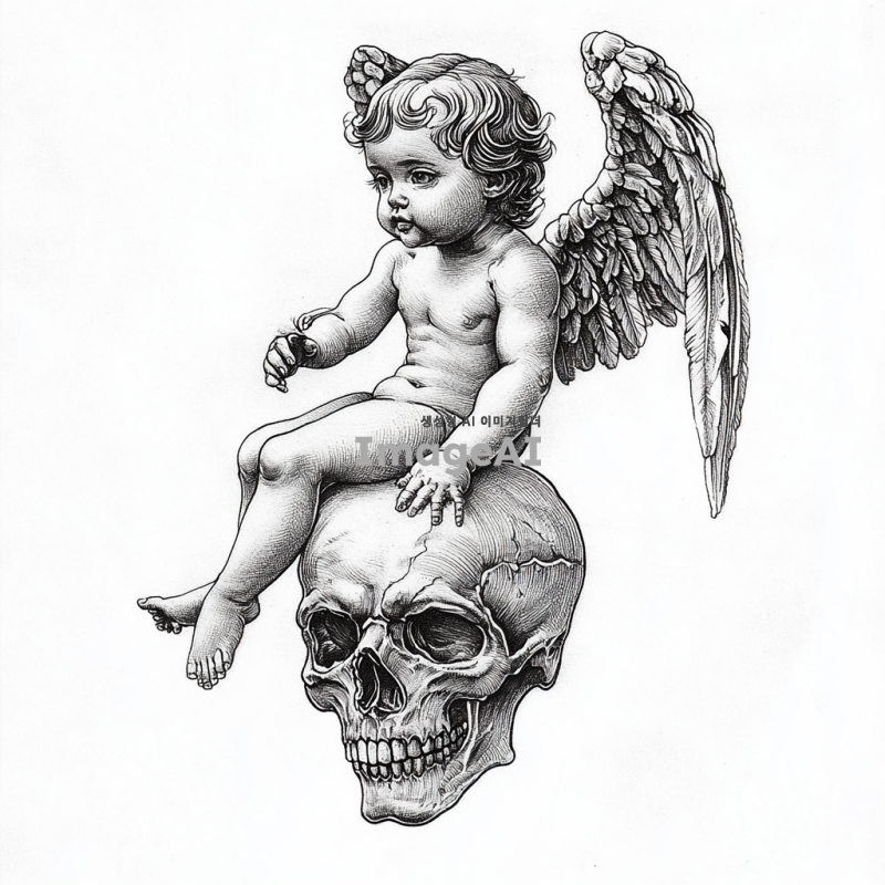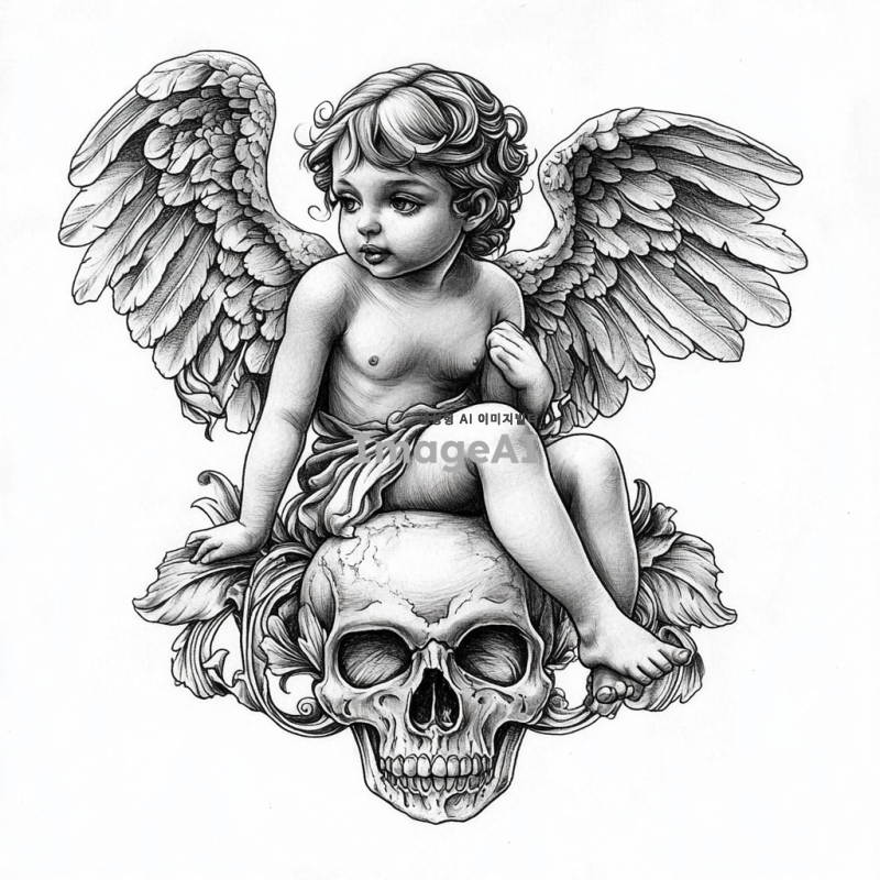 아기 천사가 해골 위에 앉아 있는 타투 디자인, 검은색과 회색으로, 흰색 배경, 매우 세밀하게 표현됨.
