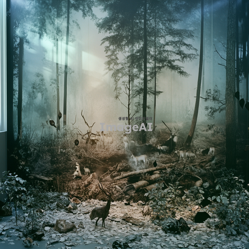 위기의 숲을 주제로 한 설치 미술을 표현한 이미지, 고요한 숲 속에서 나무들이 베어지고, 동물들이 도망치는 장면, 파괴된 생태계를 강조하는 음향 효과를 상상하게 만드는 요소들, 잔해와 함께 남겨진 자연의 아름다움, 어두운 색조와 대비되는 빛의 효과로 긴장감을 주는 구성.