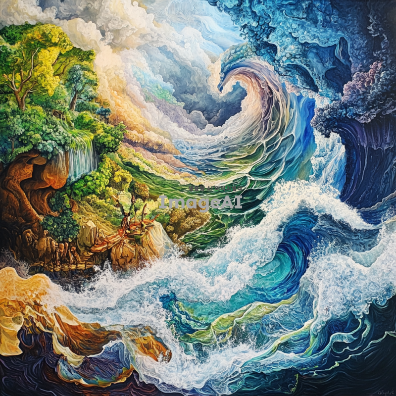 생명의 파동을 주제로 한 미디어 아트, 강과 바다, 공기 속 생명체의 연결성을 형상화한 이미지. 다양한 생명체들이 조화롭게 어우러져 있는 장면, 생명의 소리가 공간을 가득 채우는 느낌을 전달하는 풍경. 자연의 아름다움과 생명력 넘치는 요소들이 함께하는 장면. 강물의 흐름, 바다의 파도, 공기의 움직임이 서로 연결되어 있는 모습, 색감과 형태로 생명의 에너지를 표현한 장면.