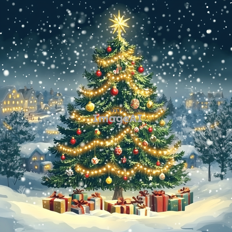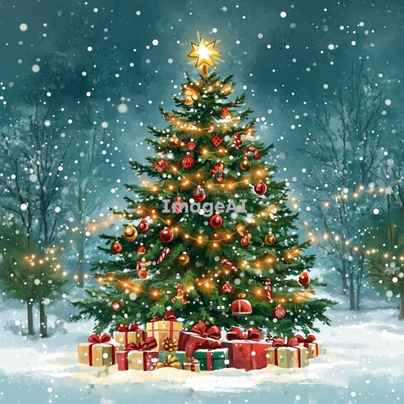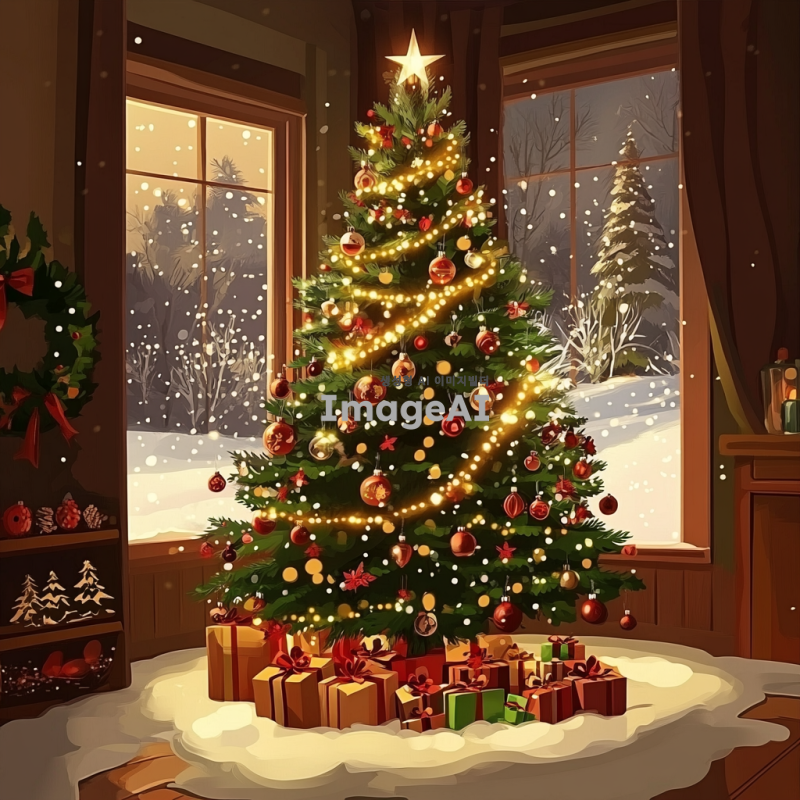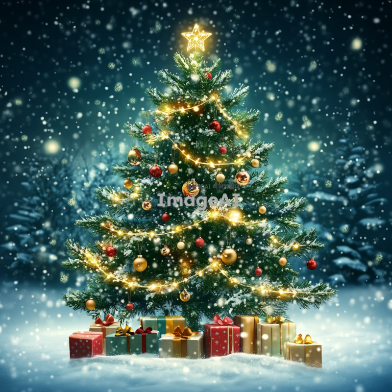 아름다운 크리스마스 트리가 반짝이는 조명과 다양한 장식으로 가득 차 있는 모습. 트리 아래에는 선물들이 놓여 있고, 배경에는 눈이 내리는 겨울 풍경이 펼쳐져 있다. 따뜻한 분위기의 색감과 함께 크리스마스의 축제 느낌을 강조해 주세요. 일러스트
