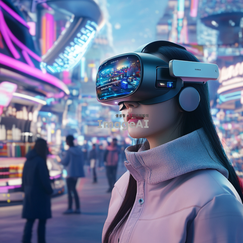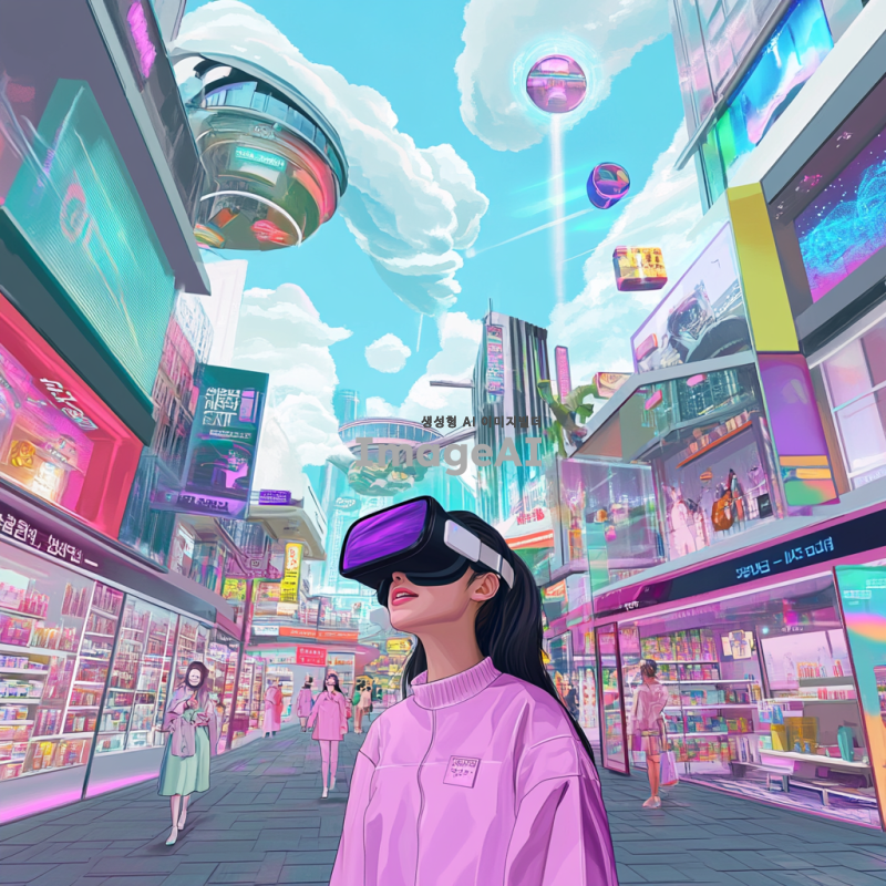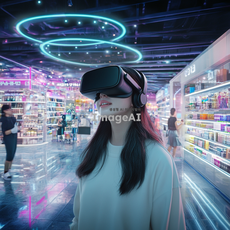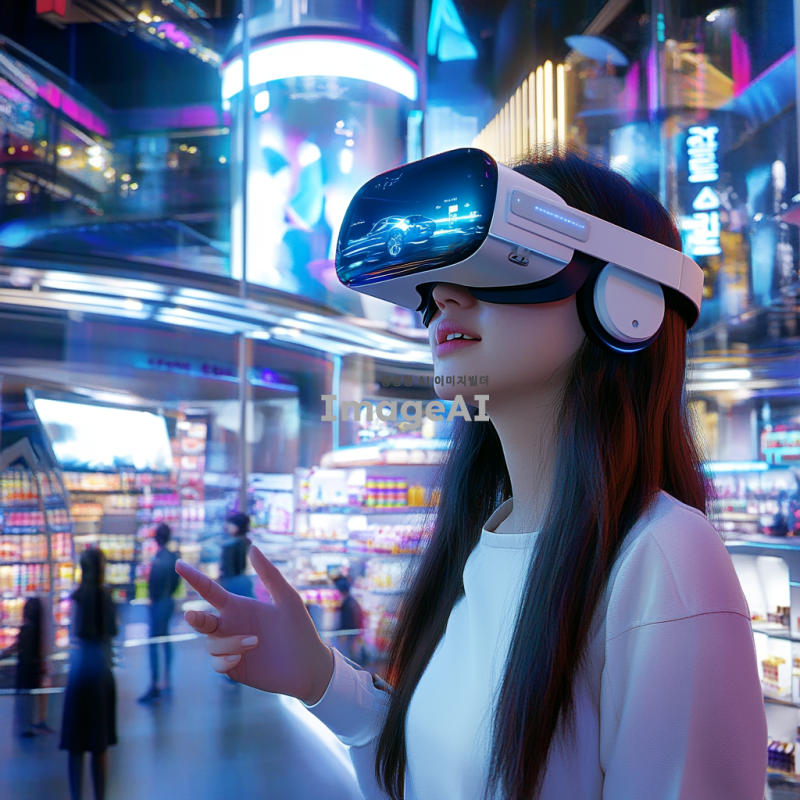 2035년의 미래 도시에서 VR 쇼핑을 체험하는 한국인 여성, 이지민. 그녀는 최신 VR 기기를 착용하고 가상 상점에서 쇼핑을 즐기고 있다. 다양한 상품들이 진열된 매장 안에서 자유롭게 이동하며, 실제 오프라인 쇼핑처럼 상품을 만져보고 체험하는 모습. 배경에는 현대적인 건축물이 즐비하고, 사람들은 VR 기기를 착용한 채로 쇼핑을 즐기는 모습이 보인다. 화려한 색감과 미래적인 분위기를 강조하여, VR 쇼핑의 혁신적인 경험을 시각적으로 표현한다.