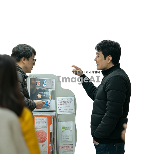 한국의 한 가전제품 매장에서 저렴한 가격에 가전제품을 구입하는 장면. 매장 내부는 밝고 아늑하며, 다양한 가전제품들이 진열되어 있다. 한 남성이 행복한 표정으로 세일 스티커가 붙은 냉장고를 바라보며 손가락으로 가격을 가리키고 있다. 주변에는 다른 고객들이 제품을 살펴보거나 직원과 상담하고 있는 모습이 보인다. 매장 벽에는 할인 행사 포스터가 붙어 있고, 바닥에는 깔끔한 타일이 깔려 있다.