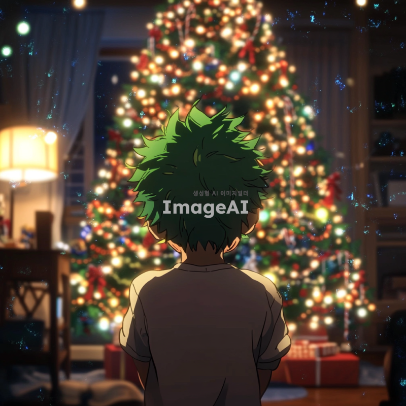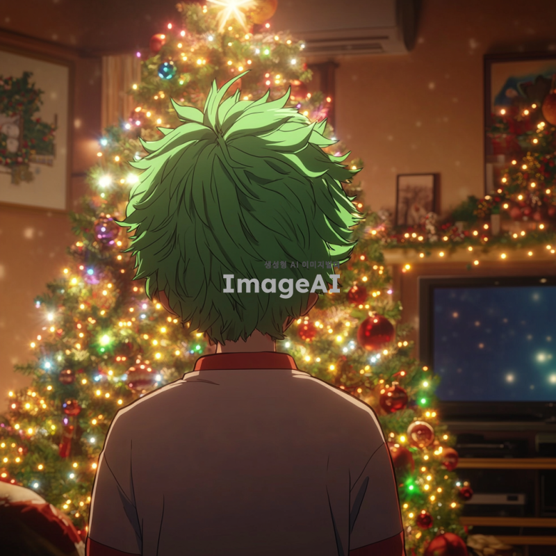 크리스마스 트리 앞에 서 있는 초록머리 소년의 뒷모습. 크리스마스 트리에는 반짝이는 전구와 화려한 장식이 가득하고, 배경에는 따뜻한 조명이 비추고 있는 아늑한 거실. 소년은 즐거운 마음으로 트리를 바라보며, 그의 초록머리는 크리스마스의 분위기와 잘 어우러짐. 일본 애니메이션