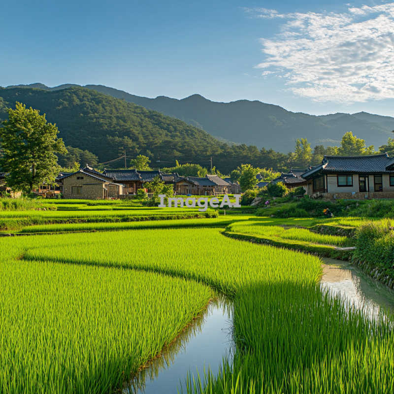 푸른 논밭이 펼쳐진 한국의 전통 마을 풍경, 햇살이 비치는 따뜻한 날씨, 논에 물이 가득 차 있어 반사되는 하늘, 마을의 고즈넉한 집들과 그 주변의 산과 나무들, 평화롭고 조용한 분위기, 농부들이 논에서 일하고 있는 모습, 전통적인 한국의 농촌 풍경을 강조하여.